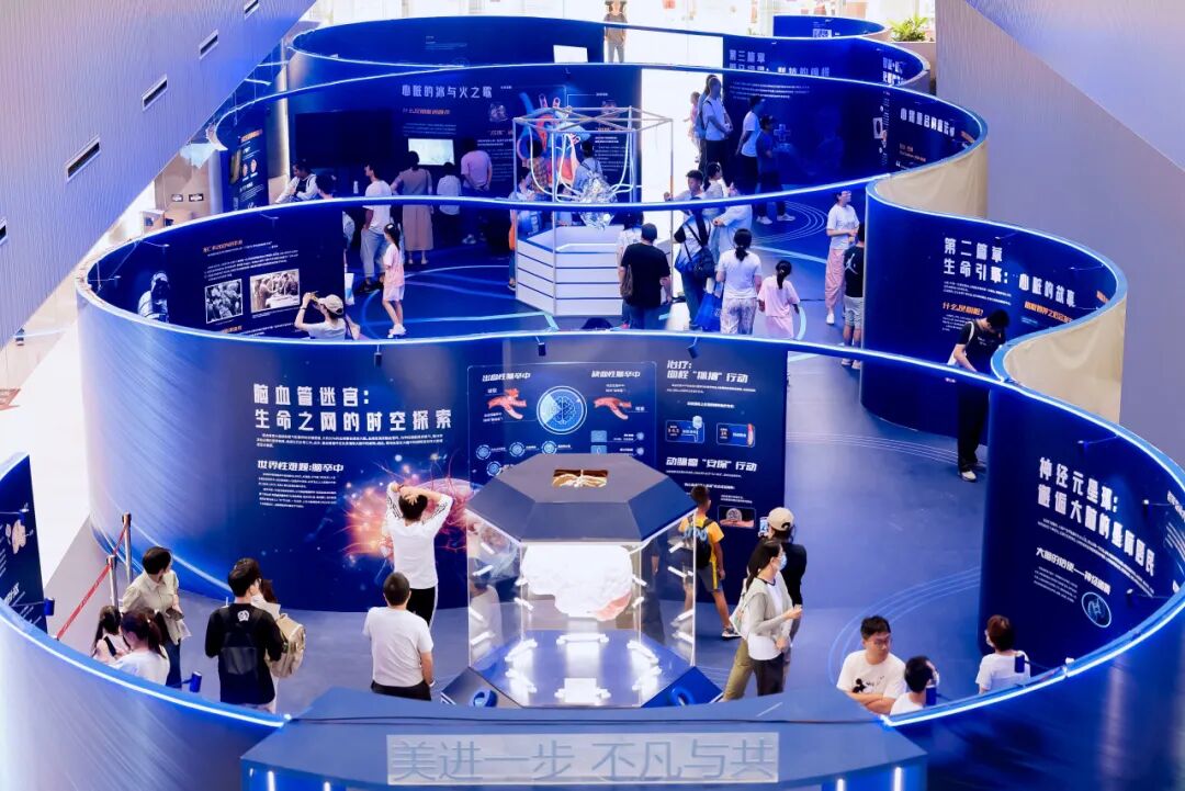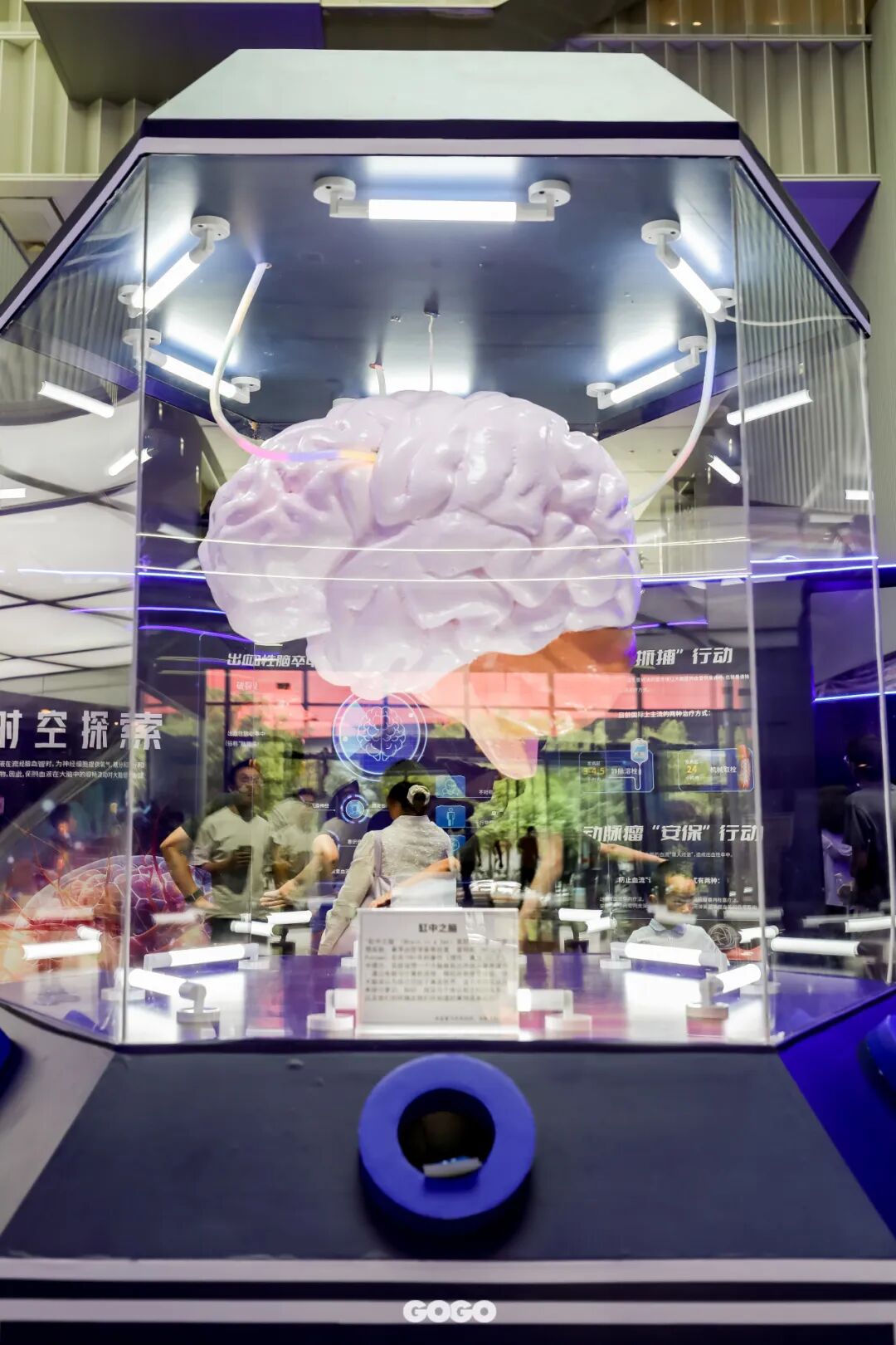 沿着空间漫步,墙面上错落的文字,向来往的每个人展示着关于大脑的基础知识图谱、大脑的神经元星球和脑血管构筑的生命之网的故事。