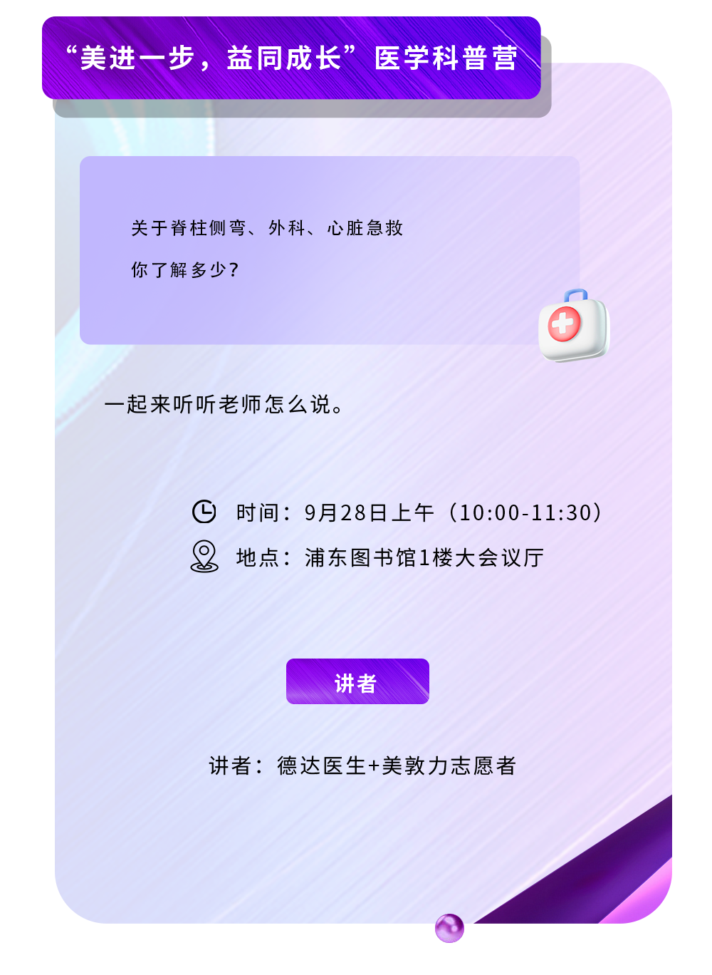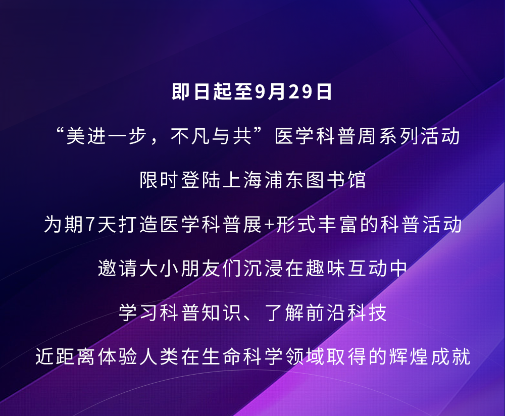 9月22日-9月29日,由浦东科学技术协会指导、上海奥奇科技发展基金会主办、上海浦东图书馆协办,美敦力公益资助的“美进一步,不凡与共”医学科普周系列活动限时开启。