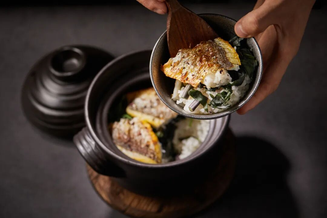 一钵喷香的釜饭,在接近煮好时铺上新鲜的野菜和煎至外酥里嫩的熟成黄鱼,各成其鲜美。上桌后,手动将一份十足有料的自制熬煮牛油和鱼肉、野菜、米饭一道搅拌均匀,香气丝丝入扣。