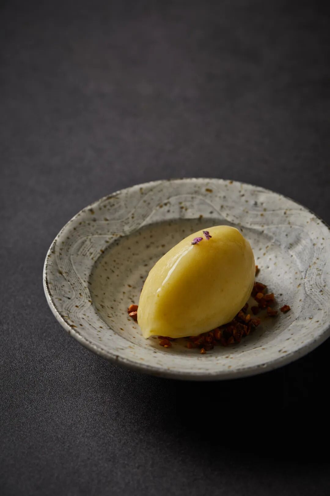 初夏时节成熟的四川宜宾水蒲桃,鹅黄莹润,形似铃铛。以此为盏,对半切开,盛入满满的和牛肉泥、新鲜核桃仁片、马蹄丁、甜笋丁,柔韧与爽脆的口感形成多元的层次,满口都是清新迷人的自然香气。