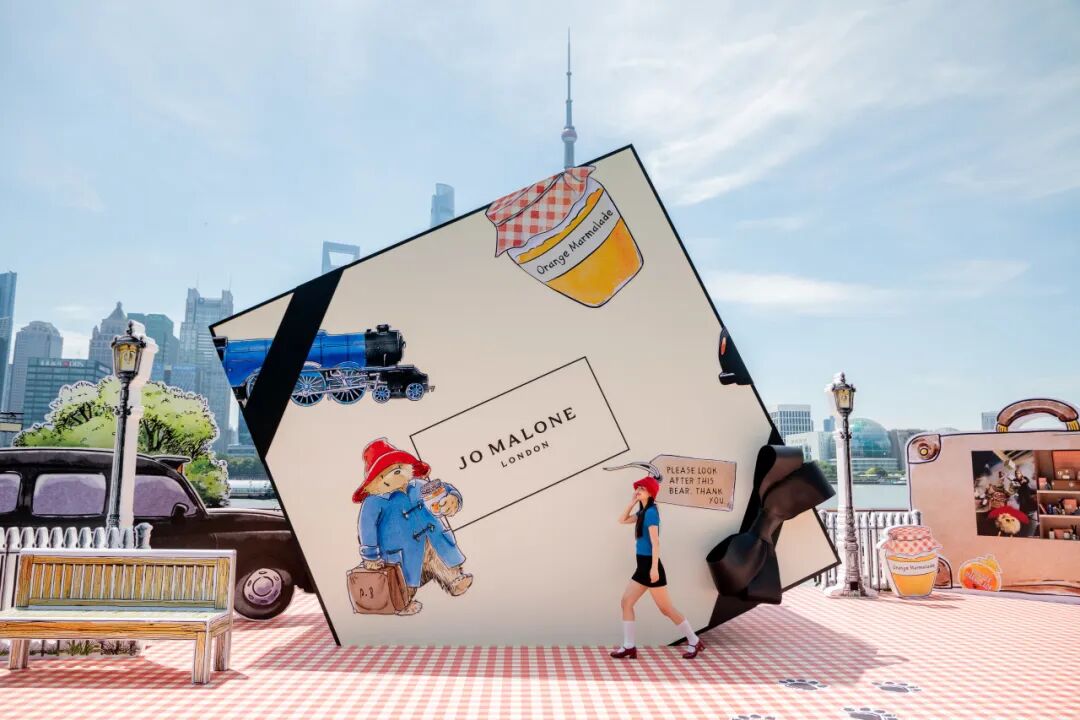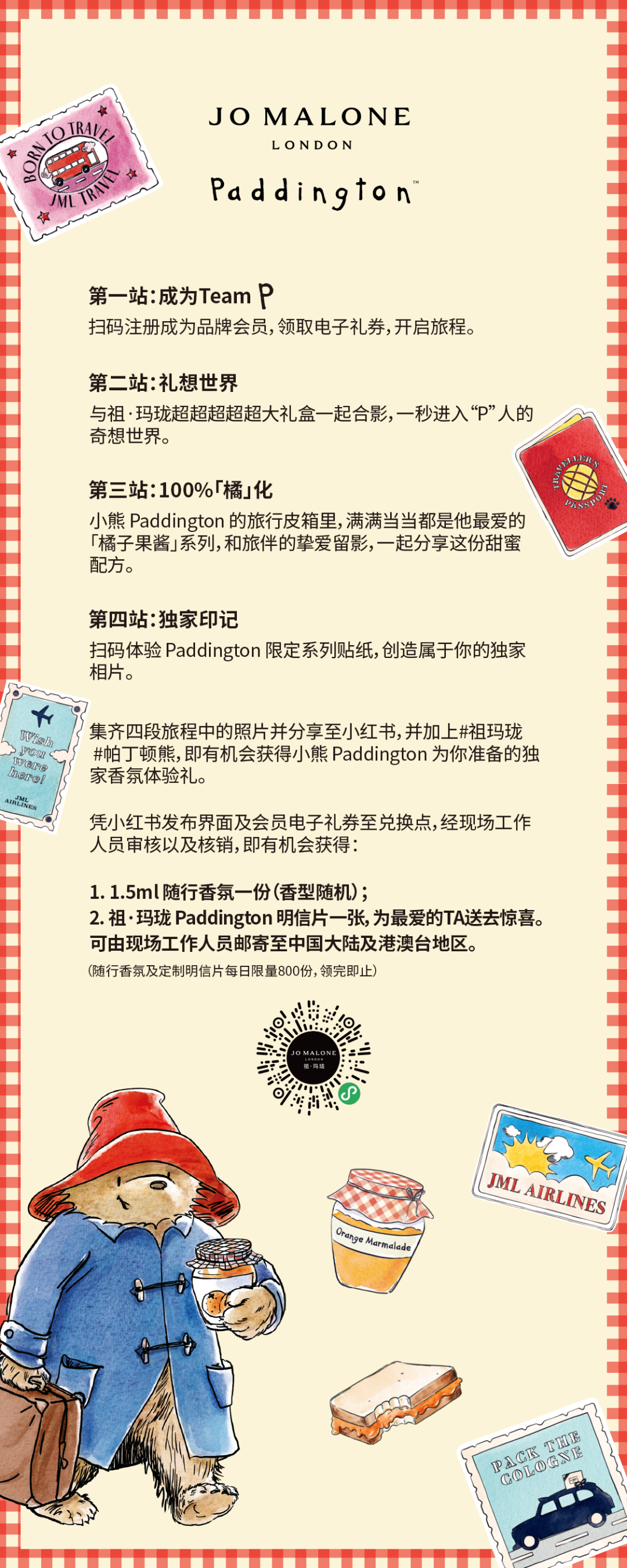 帕丁顿熊不远千里从英国带来的祖·玛珑巨型礼盒也在此掉落,红白格子场景下衬托出浓浓复古英伦气息。悠悠香气袭来,顺着香气在小熊落下的大号行李箱里发现他最爱的「橘子果酱」——哇!是祖·玛珑和帕丁顿熊的限定联名香氛。