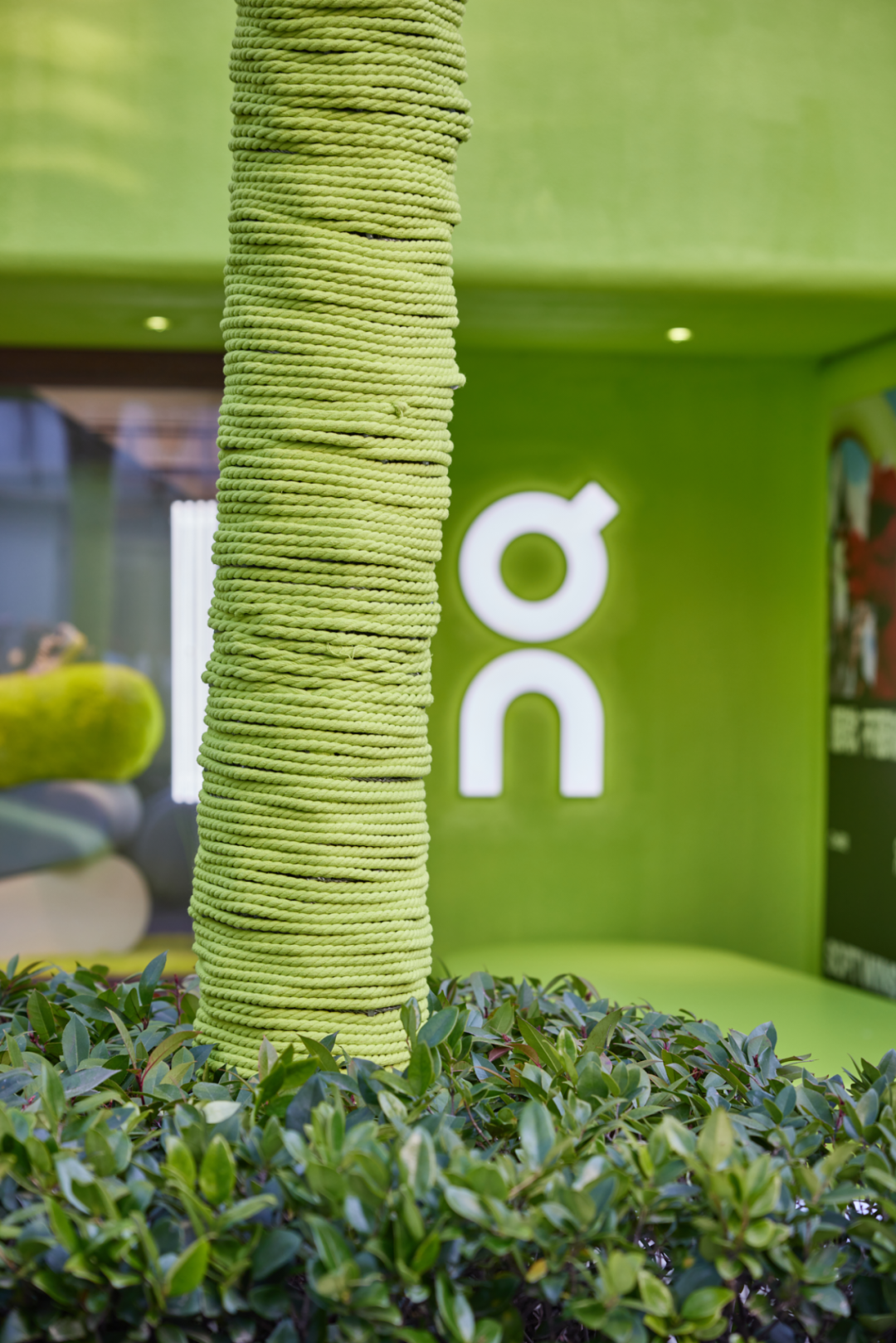 店铺的外墙被铺上清新的绿色“毛毯”