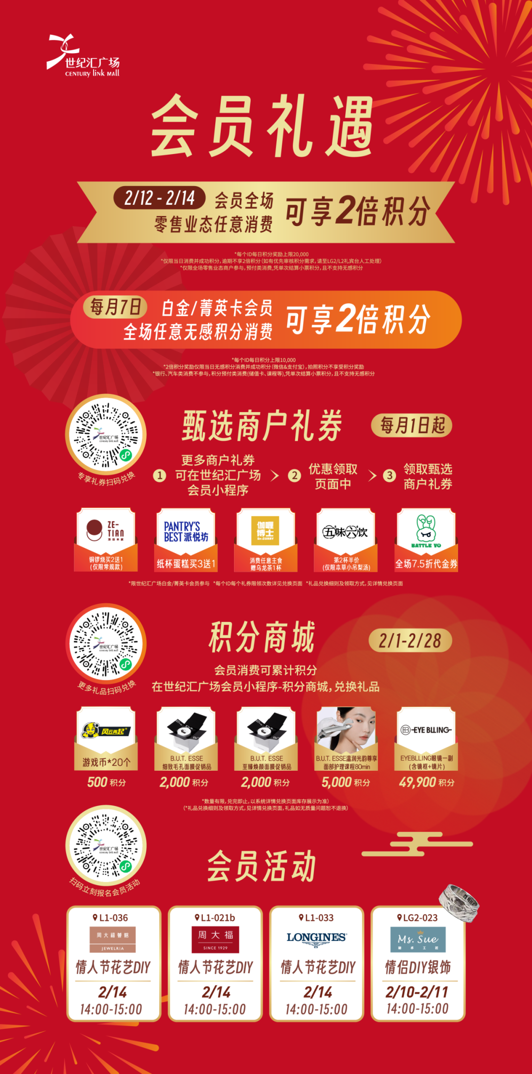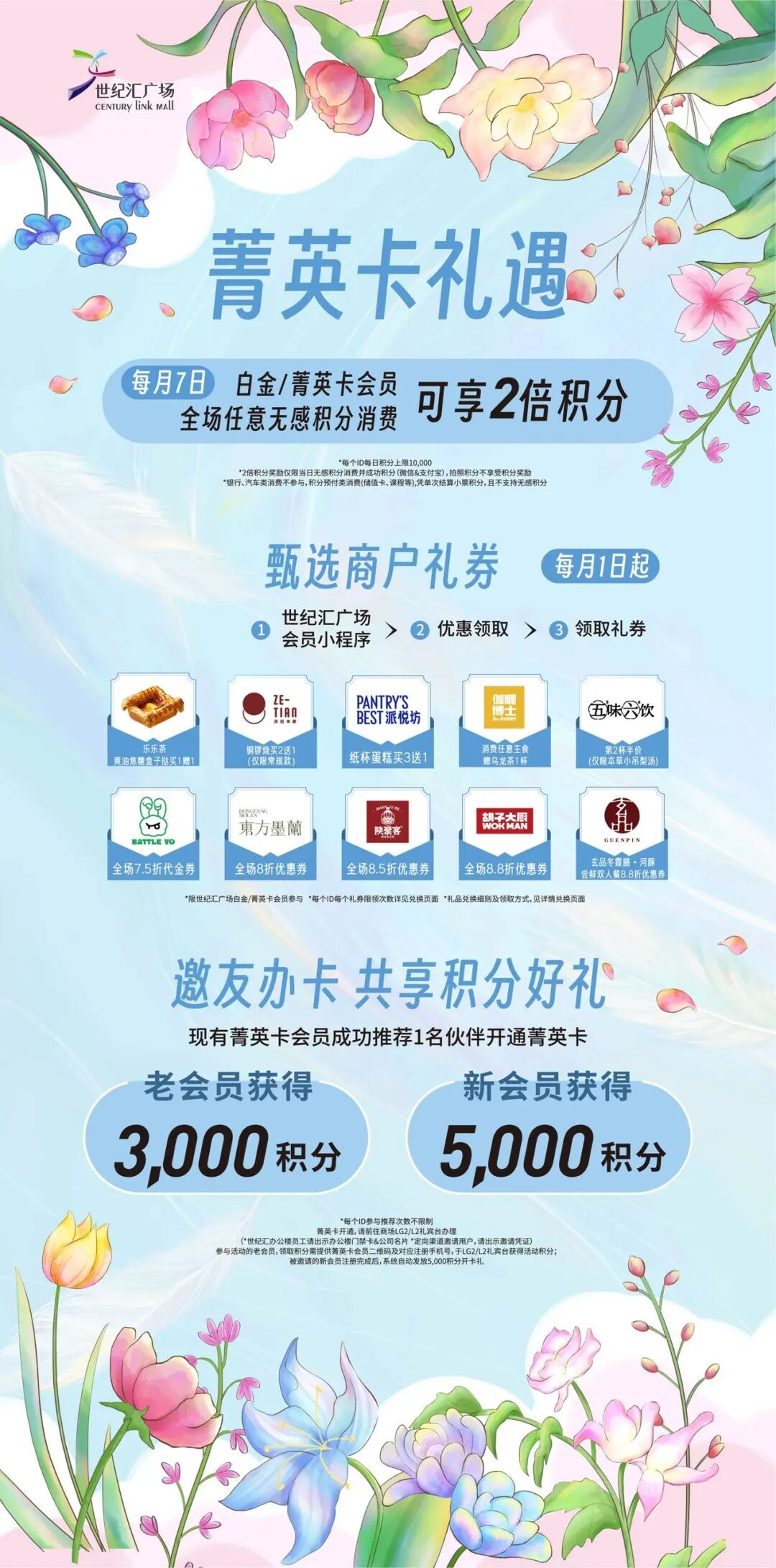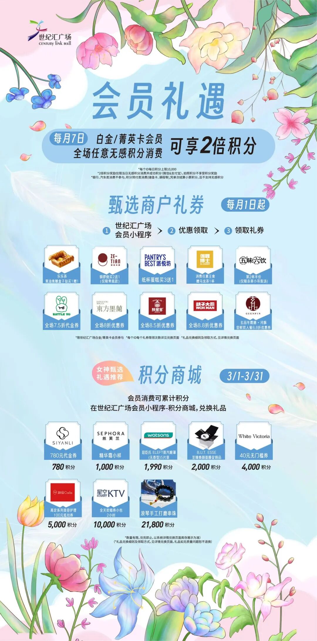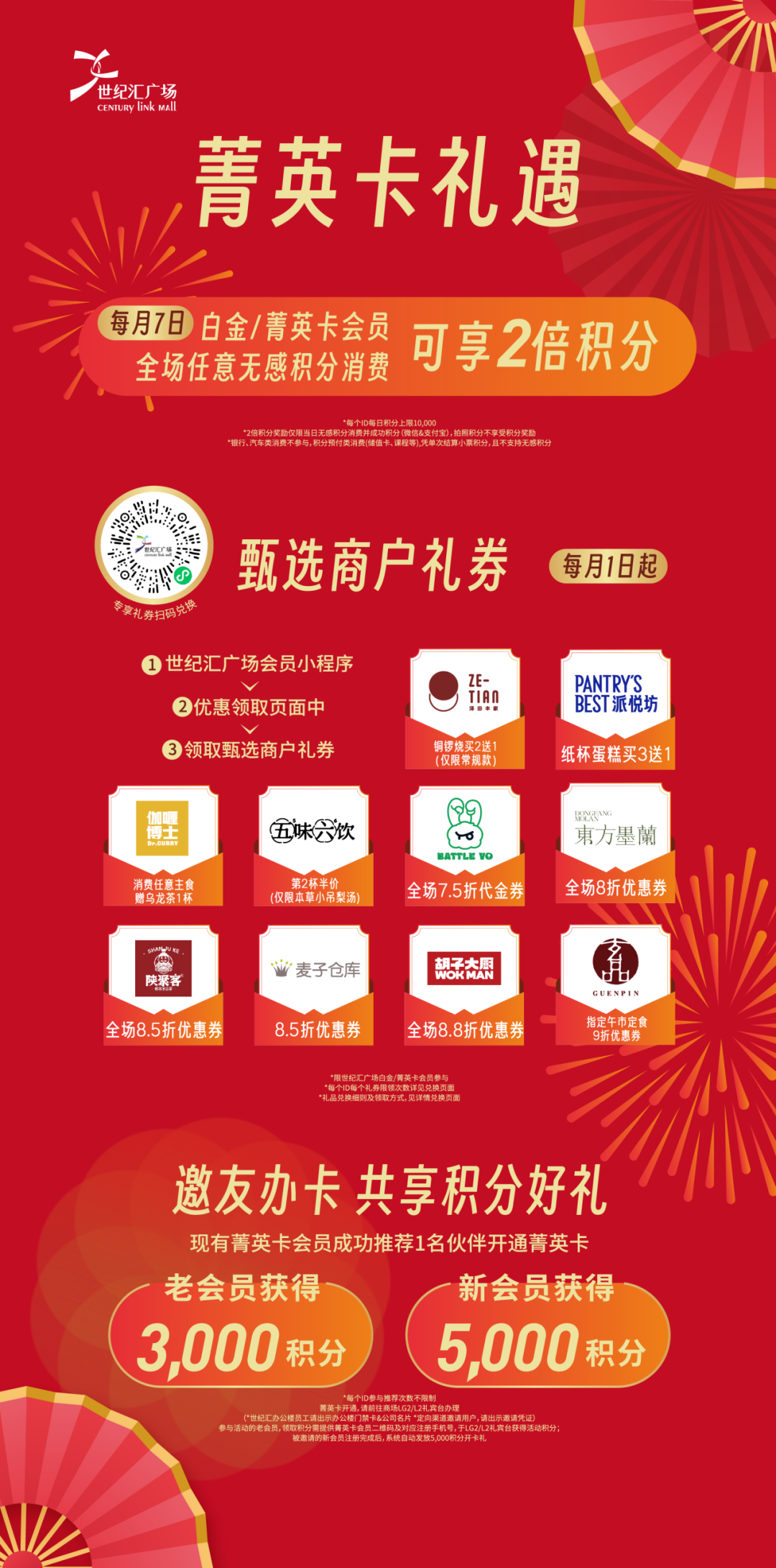 每月7日为会员专属日,白金/菁英卡会员全场任意无感积分消费畅享2倍积分;每月1日起,可领取甄选商户优惠礼券,会员消费可累计积分,并在世纪汇广场会员小程序-积分商场兑换心仪礼品,收获购物与赠礼的双重喜悦。此外,菁英卡会员邀友办卡,新老会员还能共享积分好礼。