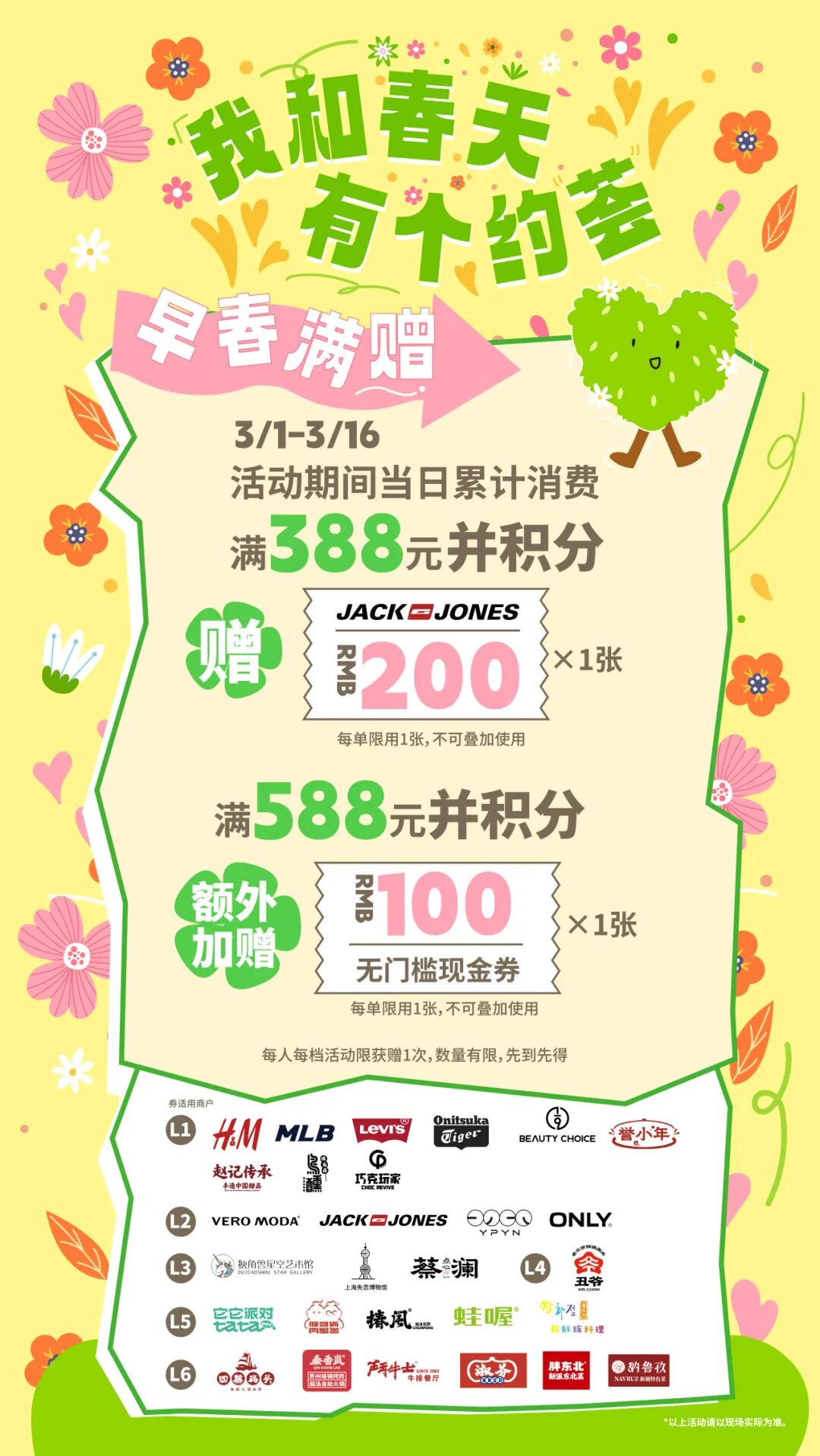 3月1日-3月16日,上海悦荟广场推出超值消费满赠活动,喊侬一道薅羊毛!全场当日累计消费满388元,赠JACK&JONES 200元券;满588元额外获赠100元无门槛现金券1张。福利满满,惊喜不断!