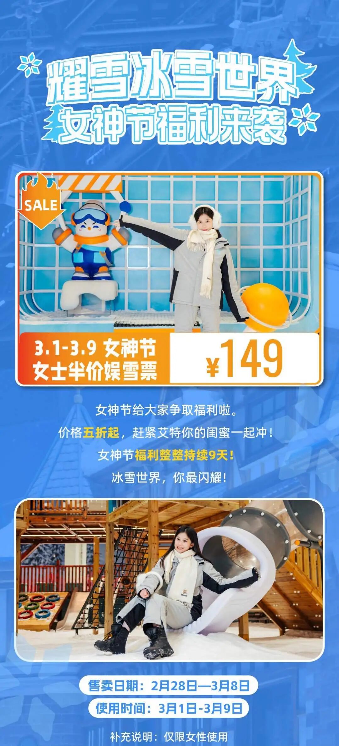 北方冰雪渐融,户外滑雪进入倒计时。但是属于耀雪的“白色狂欢”永不停歇!来全球最大窒内雪场,解锁最新福利和玩雪自由!千呼万唤的滑雪次卡限时来袭。女神节福利上线,女士娱雪票五折起!延续四季冰雪狂欢!