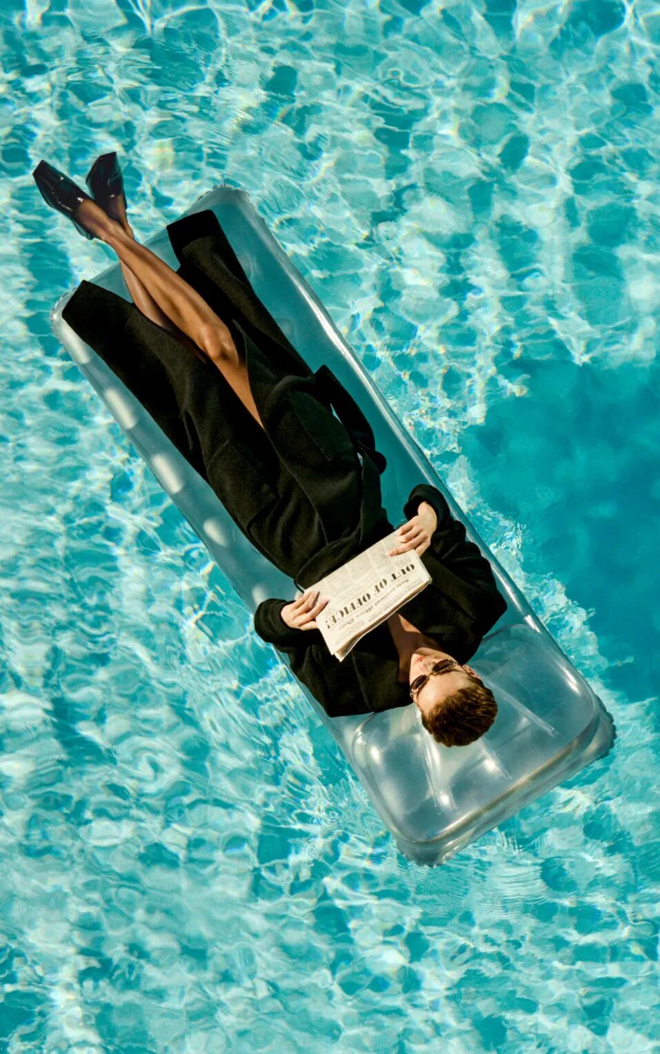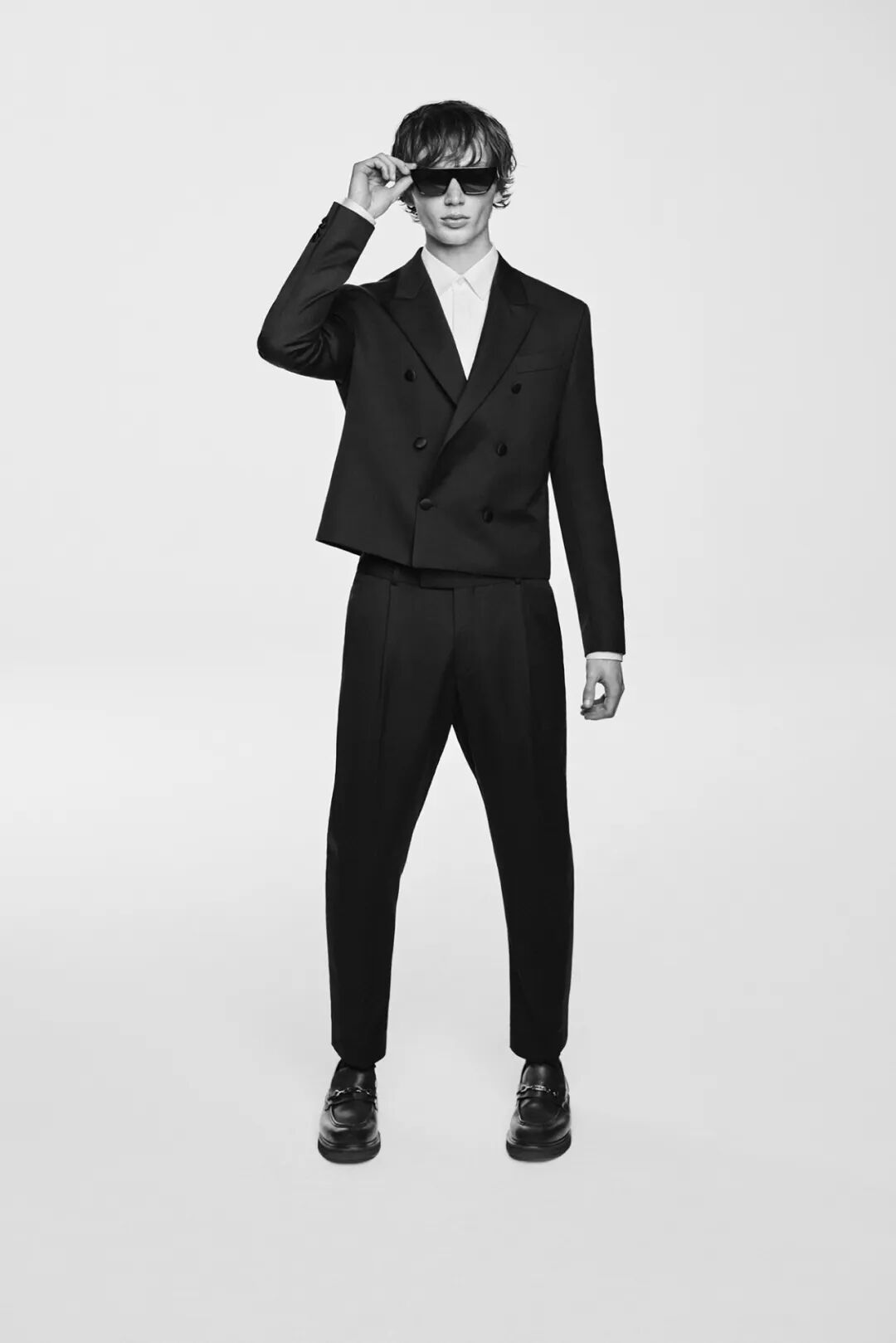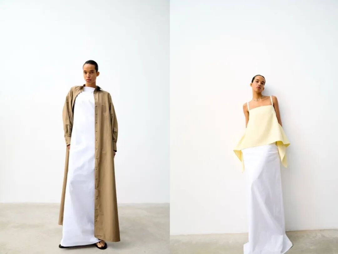 H&M Studio 2025春夏系列聚焦现代女性的多元穿搭需求,描摹出兼具优雅与力量感的女性轮廓。长款黑色大衣选用细腻的圈绒面料,立体肩部设计尽显干练风范;经典蓝色衬衫连体衣搭配白色衣领与袖口,简约中释放摩登姿态;灰色褶皱连衣裙则以披肩元素增添灵动意致。本季系列中,抽象水波纹印花衬衫、挺括西装套装与灰色短款高领尼龙夹克,轻松满足从都市到泳池派对的多场景造型切换。配饰方面,大号防水手拿包、金属框墨镜与线条锐利的鞋款,以独特细节为整体造型营造视觉张力,诠释现代女性自信魅力。