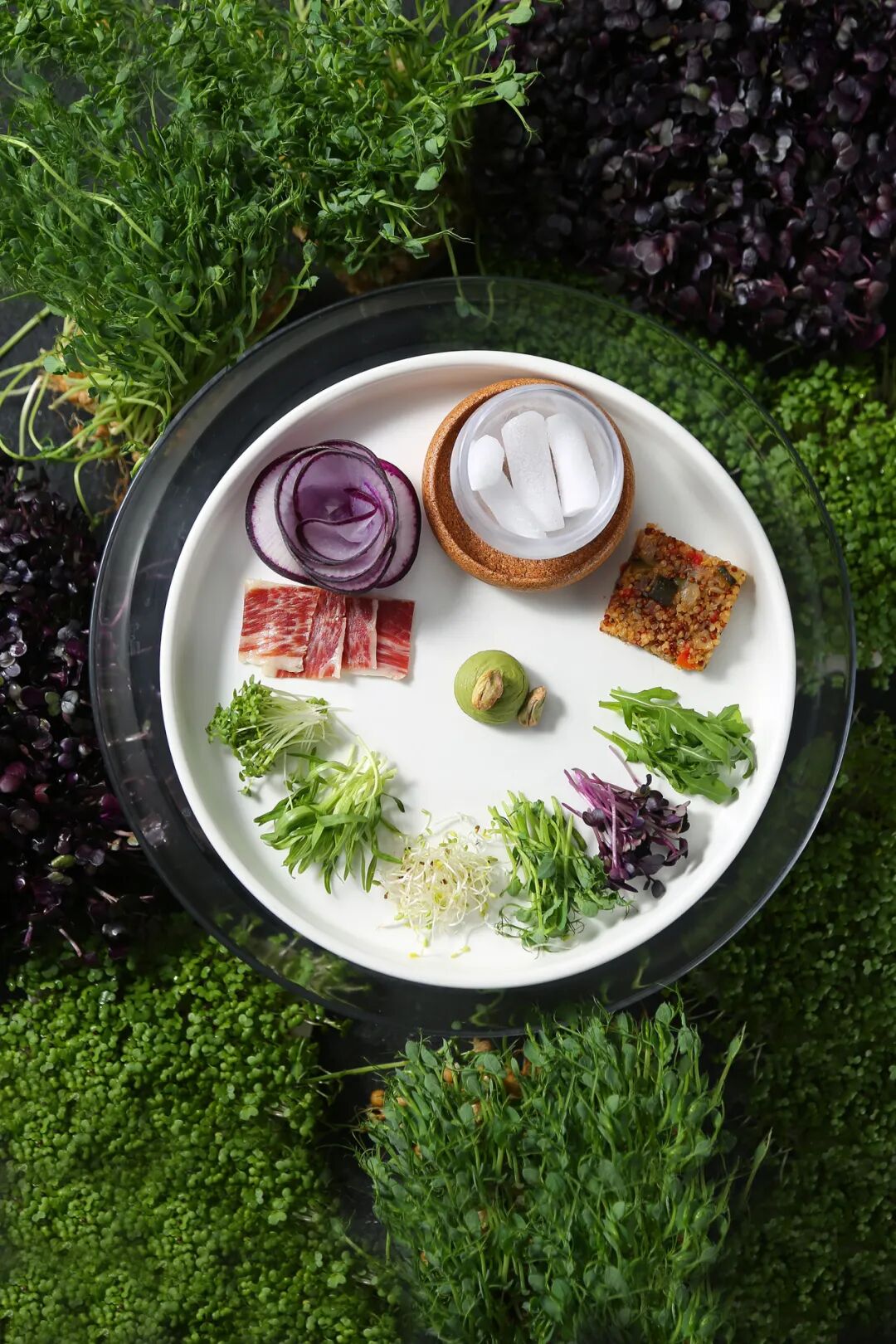 宫廷鲜苗沙拉的设计灵感源于法国著名的“太阳王”路易十四,传说他对沙拉有着极致奢华的追求——极致新鲜、极致美味、极致营养。主厨精选多种新鲜蔬菜及幼苗,如彩虹般丰富多彩,搭配了主厨秘制的开心果酱,香味浓郁。