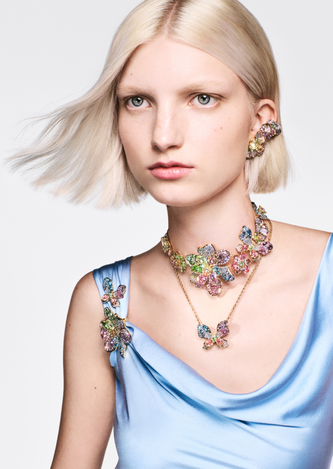 Enchanted Lotus莲花系列的灵感来源于对戴比尔斯具有非凡意义的博茨瓦纳,该系列向博茨瓦纳奥卡万戈三角洲的自然奇迹致敬,在那里,不计其数的莲花向阳绽放。莲花日出而绽、日落而息,循环往复,令人着迷,在世界各地的许多文化中,莲花代表着纯洁与新生。