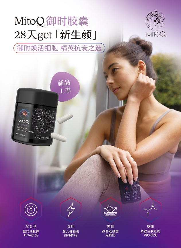 随着现代⽣活⽅式的改变,衰老的迹象已不再仅仅表现在外貌上,更深层次的抗衰需求正在引领新⼀轮科技⾰命。MitoQ御时精英Derma Elite胶囊的全新上市,正是顺应这一全面抗衰健康趋势。无论是年轻女性,还是步入中老年、追求健康与抗衰的消费者,MitoQ御时精英Derma Elite胶囊,以及MitoQ旗下各款针对细胞衰老的功能性产品,正在通过创新科技解决传统抗氧化剂难以有效渗透细胞内部的难题,从内而外全方位升级细胞的内源活力,应对不同年龄阶段的衰老问题,帮助女性恢复肌肤光彩,自信迎接健康挑战。