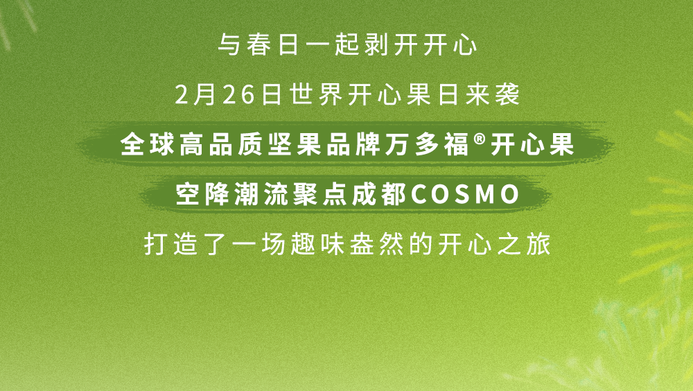作为全球高品质坚果品牌的万多福开心果,始终坚持将开心、多福的寓意传递,带来积极向上的生活态度,今年节日之际以“开心果节,开心过节”为主题,空降成都COSMO,打造一处开心聚场,注入来自加州的阳光与热情。