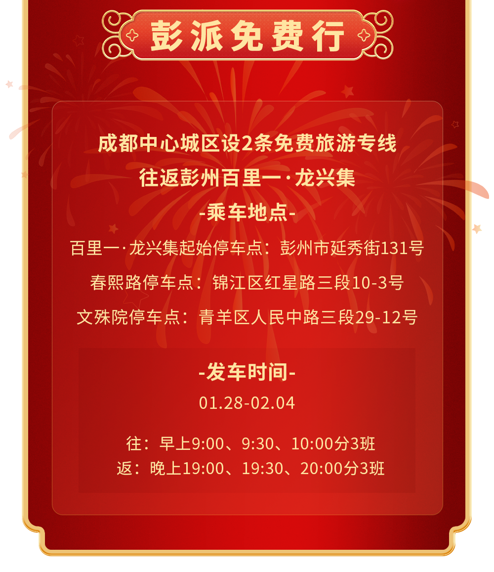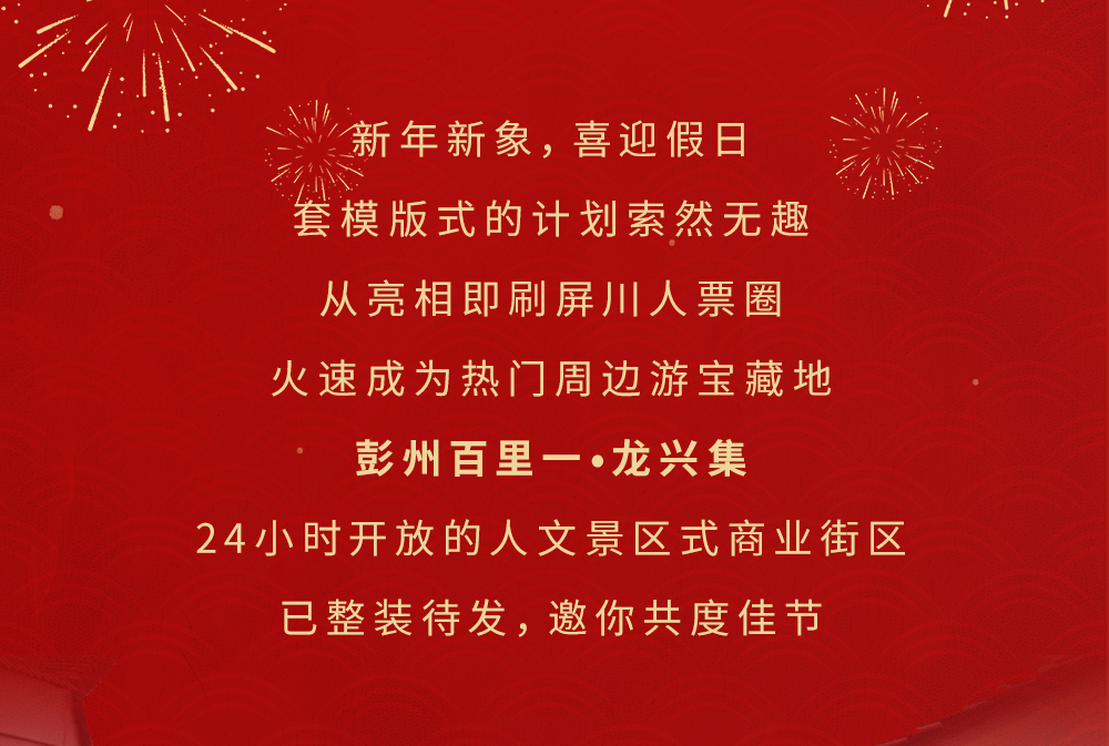 春节假日已经打响,拒绝千篇一律的安排,不妨带着万象更新的美好期许来彭州百里一·龙兴集玩转春节,不仅有不间断的精彩活动、福利,春节期间还有彭派免费行带你速达目的地!