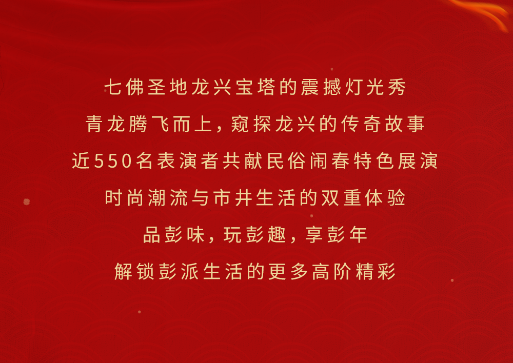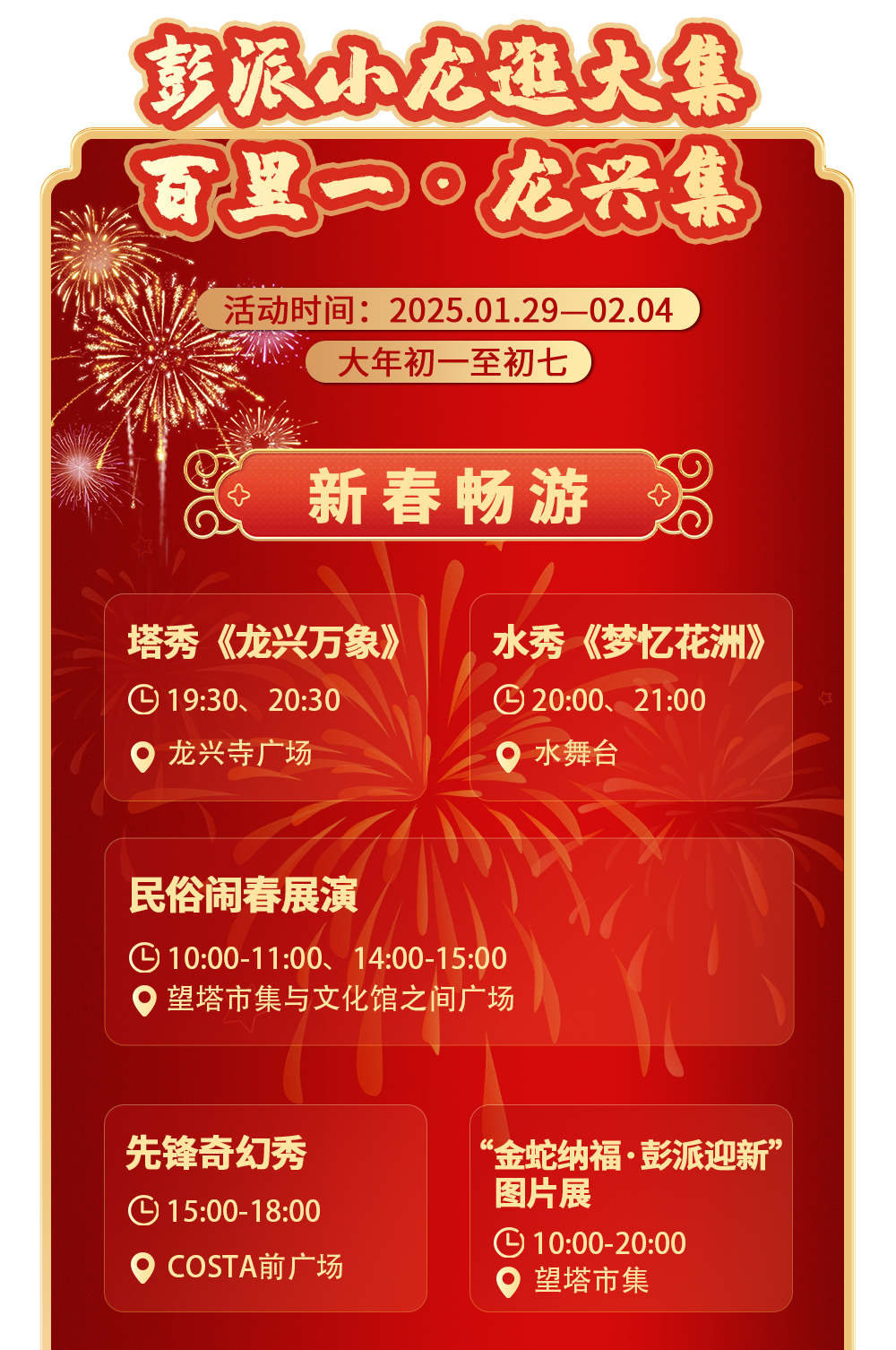 春节期间,百里一·龙兴集“彭派小龙逛大集 万事龙兴迎新年”主题新春活动也将带来彭派十足的彭州年体验。