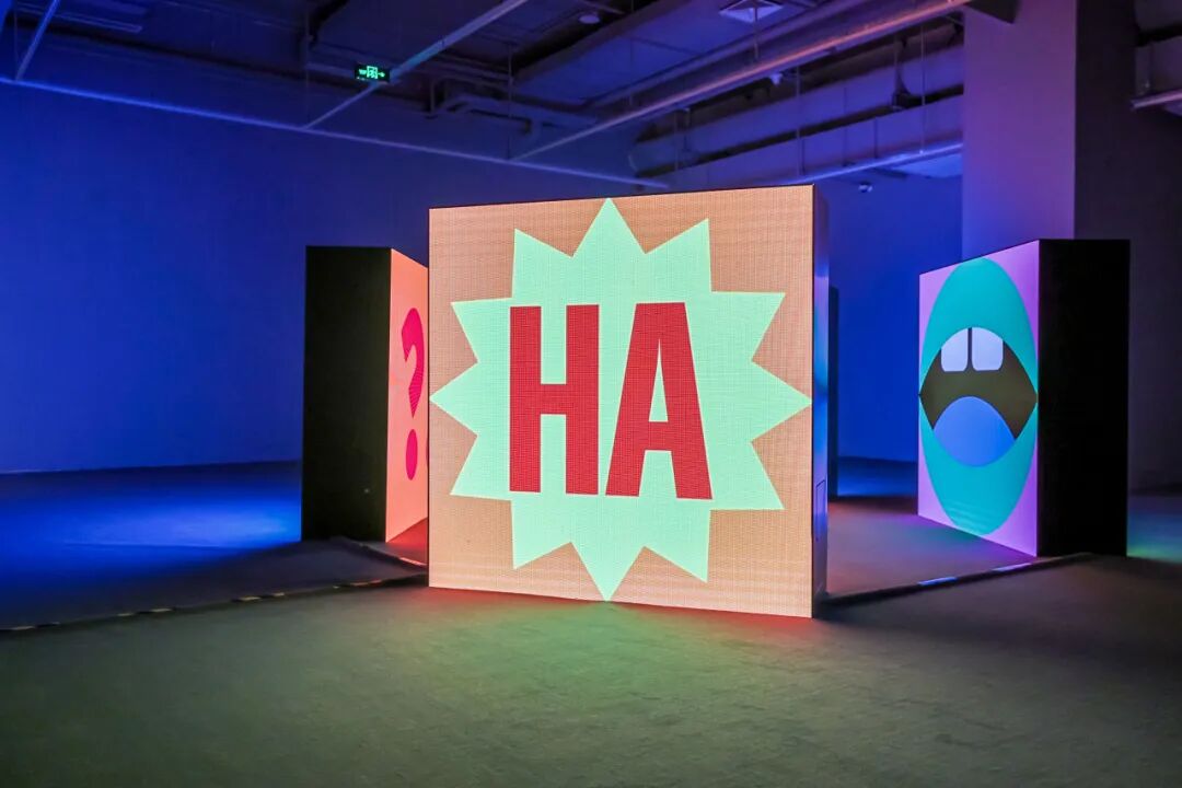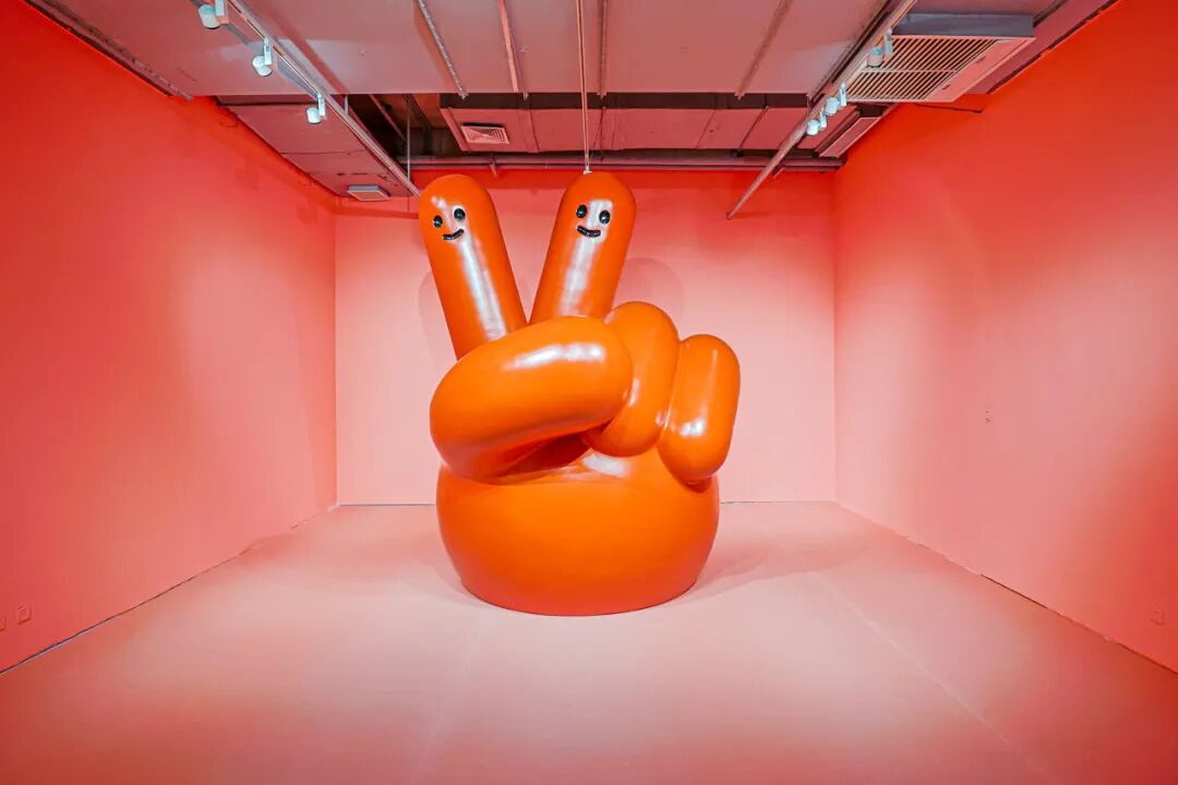 4米高的巨型手势雕塑“和平”矗立在展厅当中,用自己赤色的身躯释放温暖的信号,与所有的观众打招呼,这个可以跨越文化和语言界限无差别沟通的符号,传递出乐观、积极、和谐的艺术理想。“符号流域”装置将各式各样的图标随机在每个屏幕上闪烁,不断变化,形成新的组合。