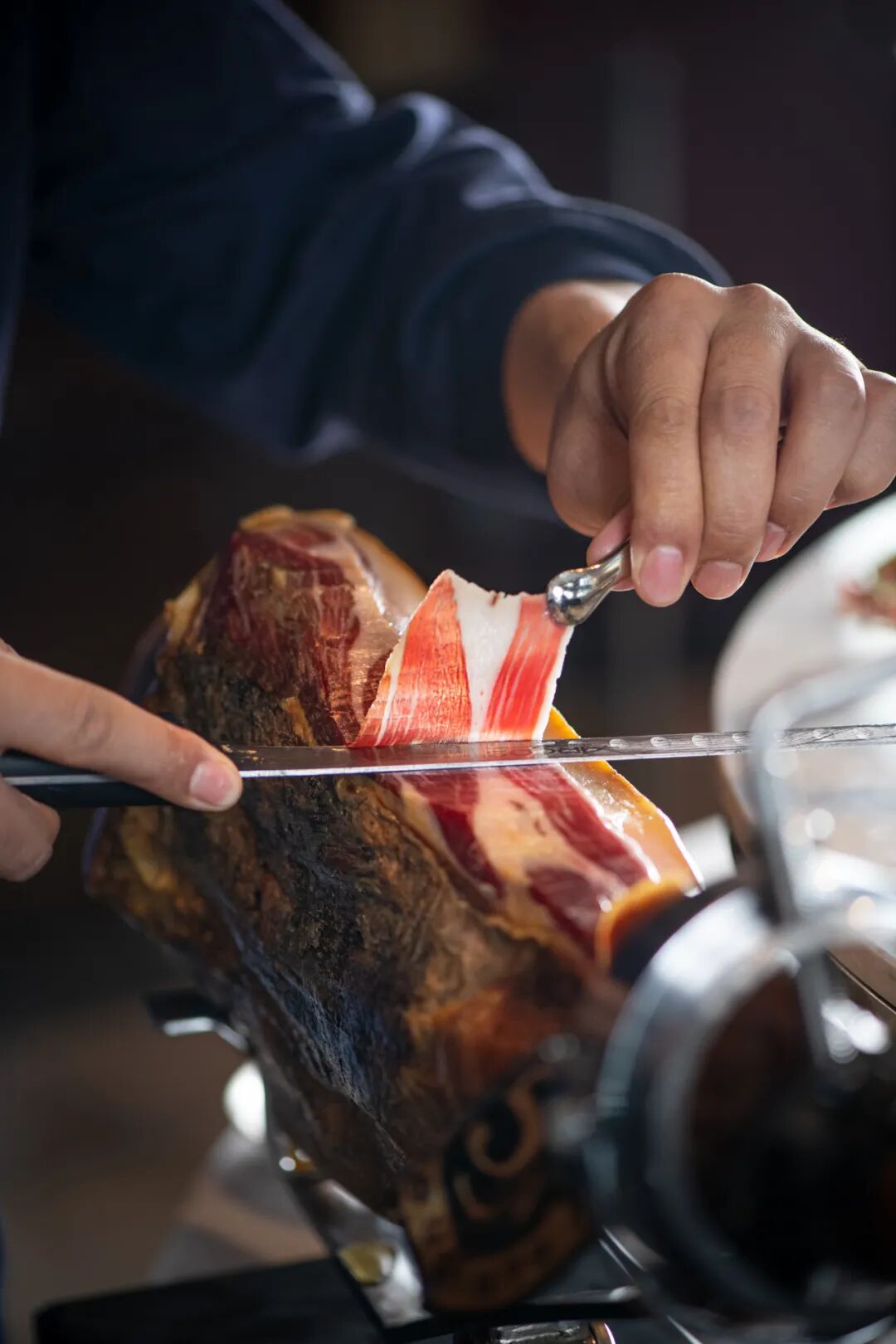 赏味来自伊比利亚的5J火腿,采用纯橡木果饲养的纯种黑猪肉具有独特坚果及橡果香气。均匀分布的“大理石纹路”,油润柔软。