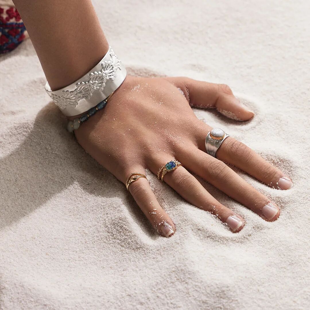 珍珠,拉长石与多种天然宝石的偶然邂逅,呈现出柔和的白色渐变,在夏日阳光的照耀下熠熠生辉。量感十足的手镯以及复古风格的戒指,雕刻花纹以古代遗迹为灵感,洗炼光辉打造手部别样风采。青金石,让人不禁联想起地中海那独有的蓝。童话世界中的神灯以及来自中东地区的护身符,美丽的异域风光映入眼帘,是充满玩心的agete吊坠。