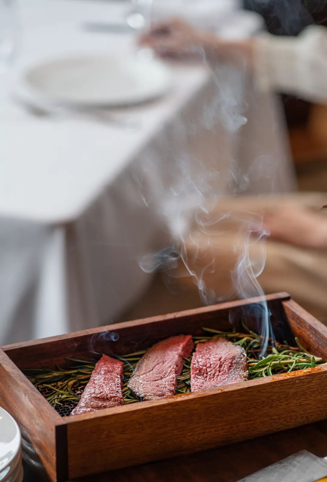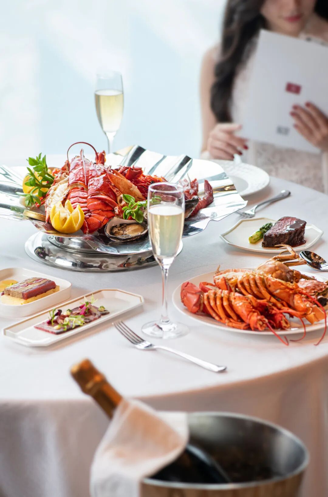每桌可悦享一份海鲜拼盘,新鲜生蚝、龙虾、红魔虾及鱼子酱等,将海洋之味呈上城中餐桌。厨师派送自制澳洲和牛牛肉串及新西兰羊肉串,采用纯中式腌制及烧烤方式,融合西式食材,创意烹饪更具时尚感。现场制作并派送「巧克力和牛」莫玉拉牛排,选自南澳的莫玉拉纯血和牛,以创新的喂养方式,在饲料中添加磨碎的巧克力、橡皮糖和草莓等,产出独特的甜味及质感。