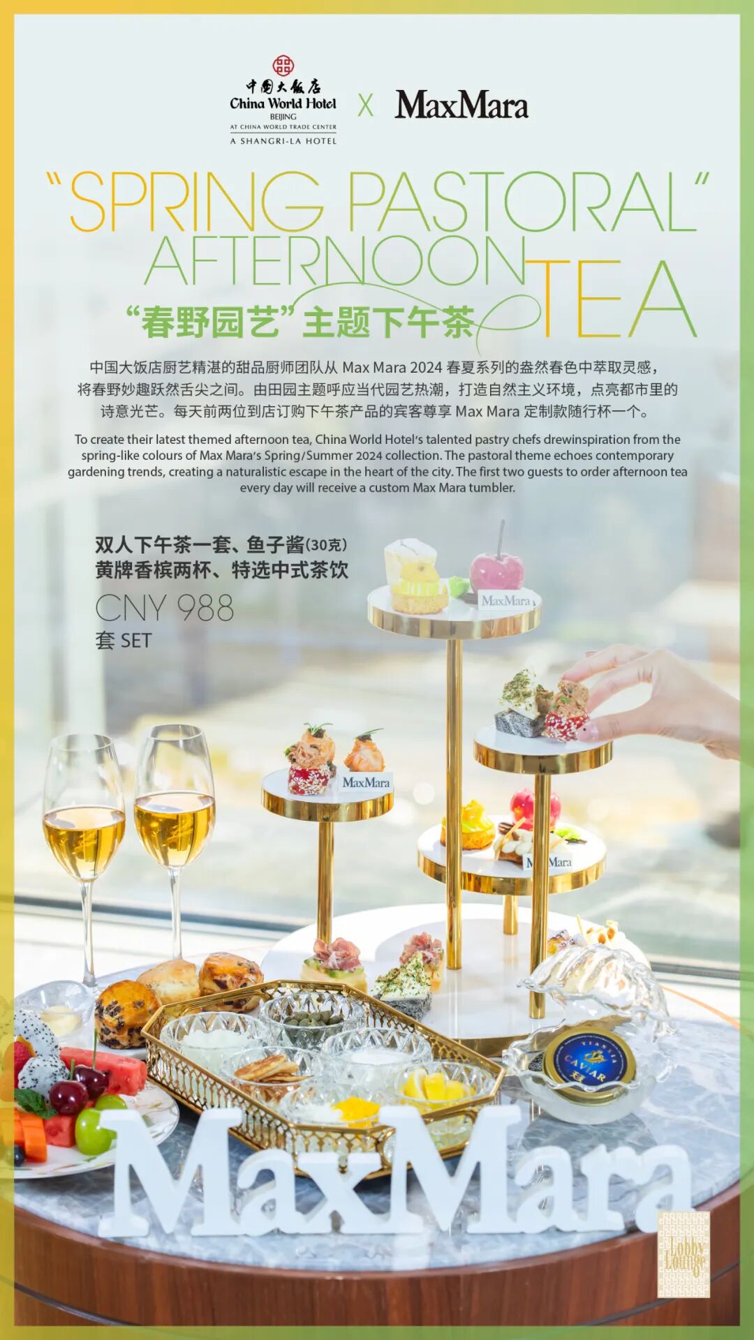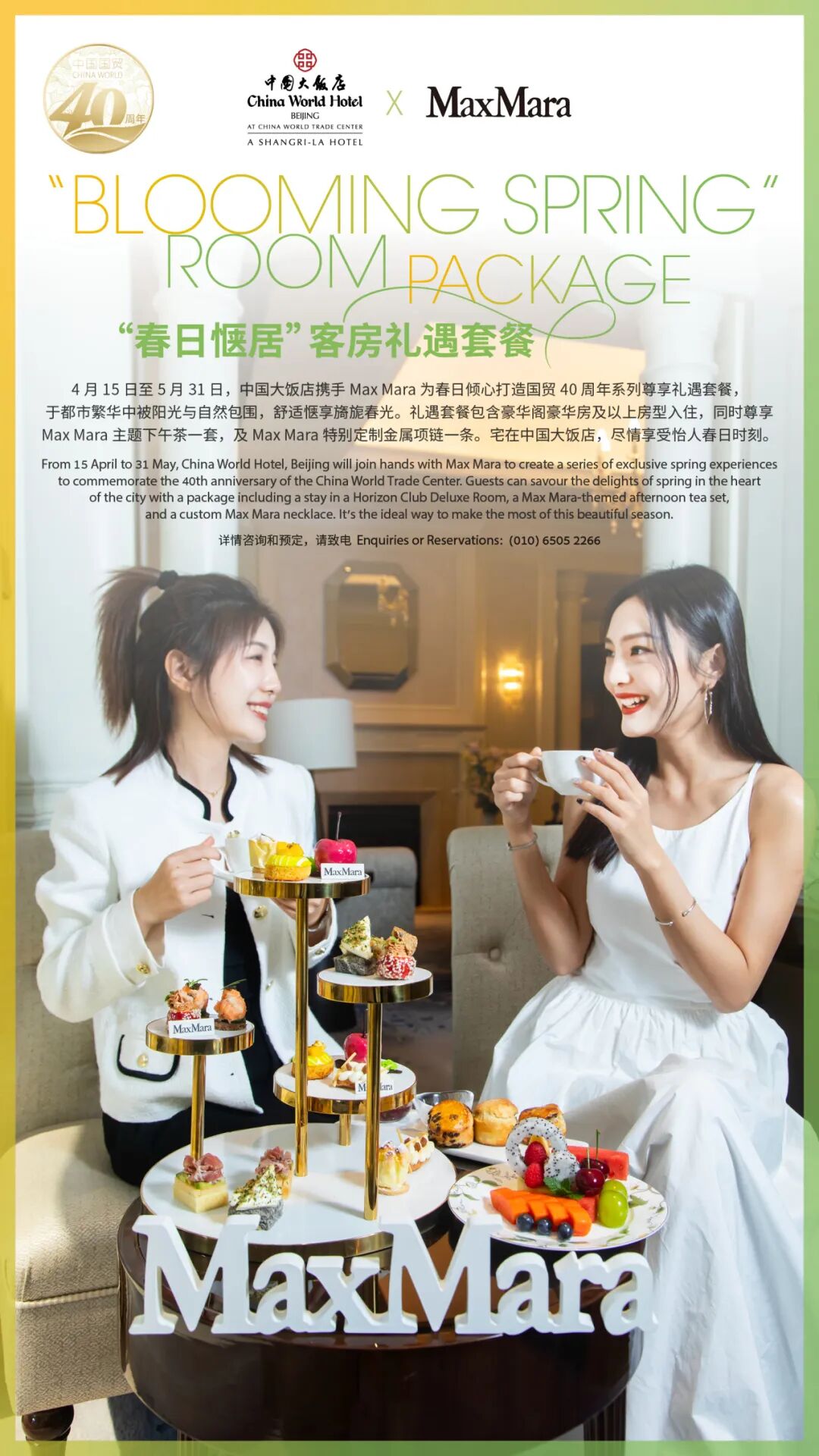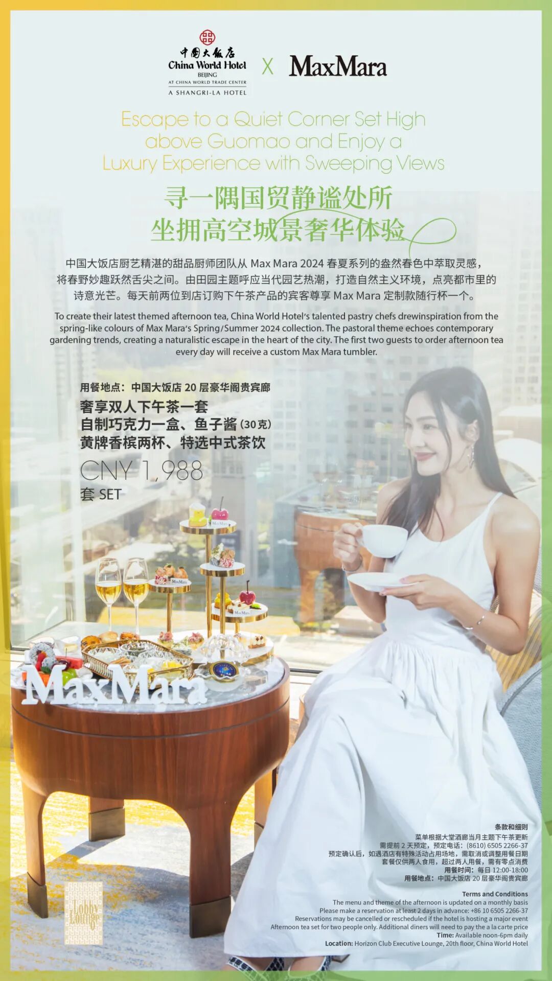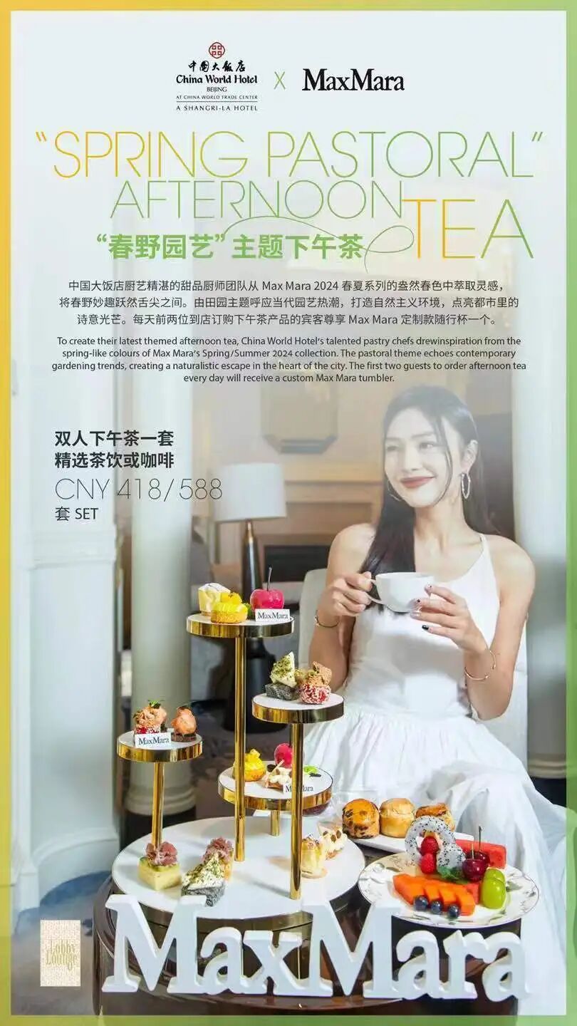 同时中国大饭店携手MaxMara打造“春日惬居”客房礼遇套餐,尊享定制品牌下午茶一套和MaxMara定制金属项链一条。
