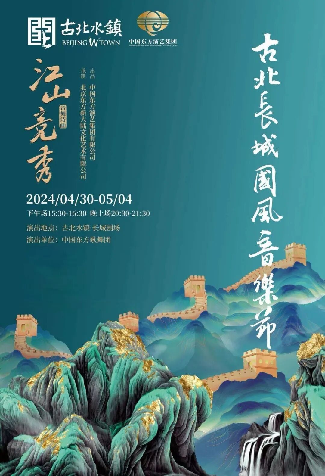 2024年4月30日至5月4日,古北水镇长城剧场将上演一场别开生面的音舞诗画《江山竞秀》演出。