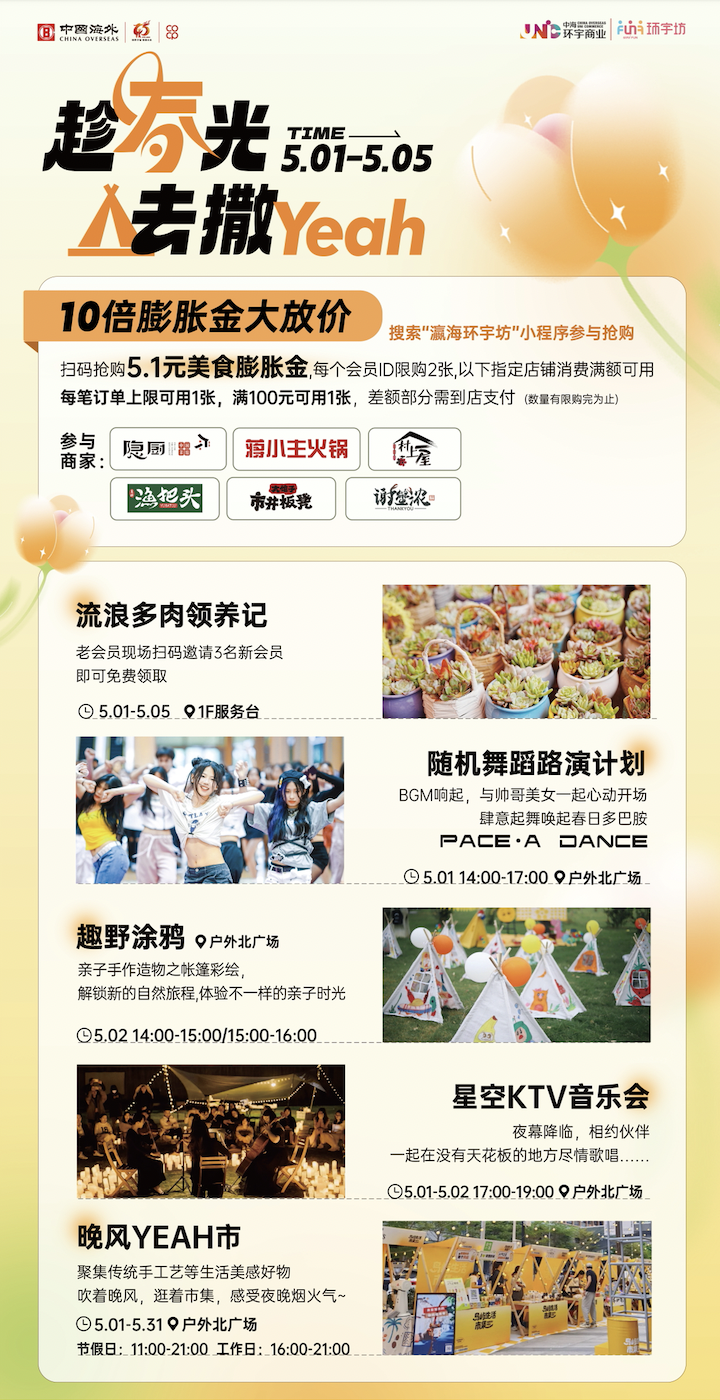 5.1瀛海环宇坊假日狂欢盛宴火爆上演!五天精彩不停歇,超值大促与一系列震撼活动让你释放假日激情!只要5.1元,即可尊享10倍膨胀优惠,吃喝玩乐更划算!流浪多肉领养记、舞蹈盛会随机路演活动、户外星空KTV音乐会,还有亲子手作帐篷彩绘之旅营造你的专属亲子时光,吃喝玩乐一站式,千万别错过!