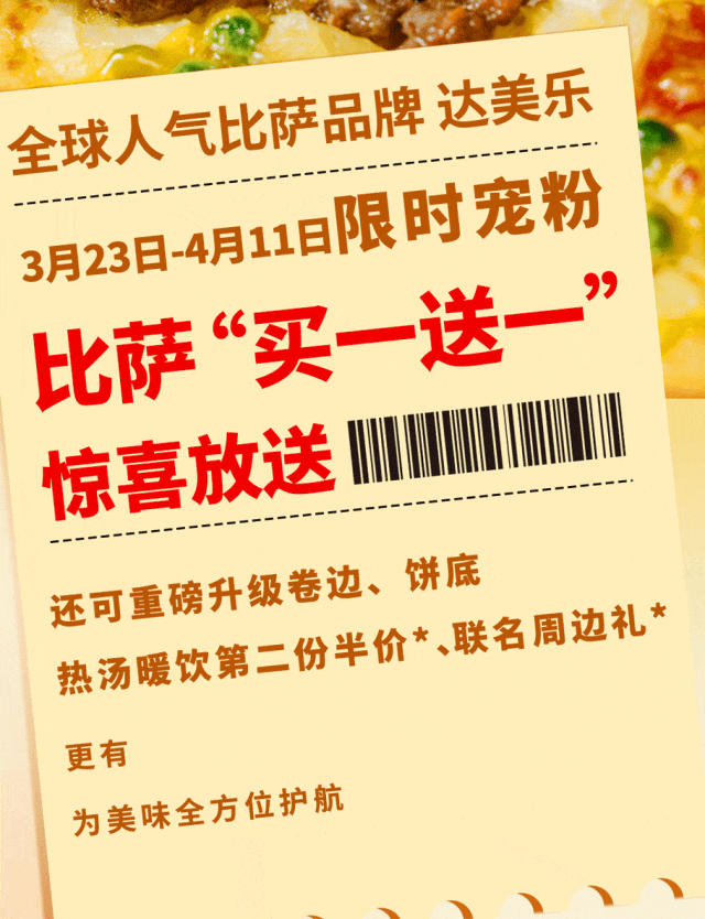 3月23日-4月11日活动期间,达美乐可真是憋了一波大的!指定比萨“买一送一”*、热汤暖饮第二份半价*、联名惊喜通通都有~gogo已整理好这份详细福利,为你食欲之欢助攻!