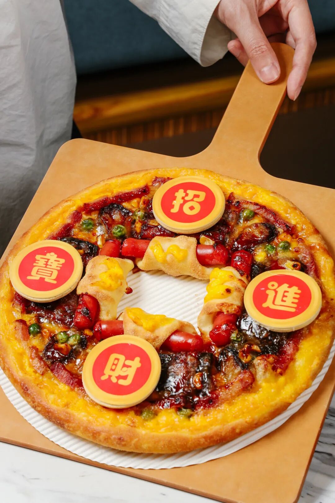 作为新春重磅尊享之作,招财进宝“鲍”富福“鳗”比萨以独特的铜钱造型,满载财富与福气的寓意,呈现比萨的节日仪式感,搭配“招财进宝”四个饼干字,让这份祝福成为美味的具象体验。