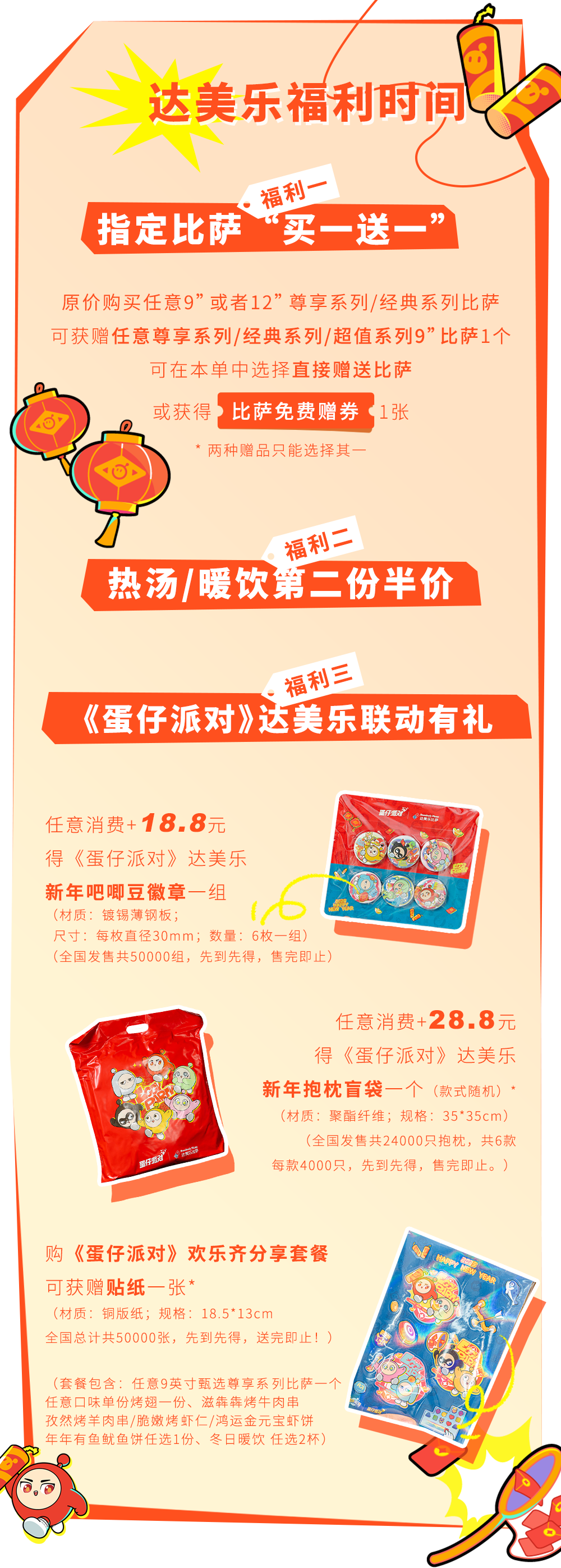2025年1月19日起至售完之日,10:00-22:00,活动期间通过达美乐比萨中国大陆官方线上渠道(官网、官方微信公众号及小程序、官方APP)/门店订餐。任意消费加18.8元即可随餐得《蛋仔派对》达美乐新年吧唧豆徽章套组一件(材质:镀锡薄钢板;尺寸:每枚直径30mm;数量:6枚一组),《蛋仔派对》达美乐新年吧唧豆徽章套组自2025年1月19日起全国共发售5万组,售完即止。*该产品非玩具,内含小部件,请勿吞食,请勿让三岁以下的儿童使用。2025年1月19日起至售完之日,10:00-22:00,活动期间通过达美乐比萨中国大陆官方线上渠道(官网、官方微信公众号及小程序、官方APP)/门店订餐。任意消费加28.8元即可随餐得《蛋仔派对》达美乐新年活力橙抱枕盲袋一个(材质:聚酯纤维;规格:35*35cm),《蛋仔派对》达美乐新年活力橙抱枕盲袋自2025年1月19日起全国共发售2.4万个,全套产品共6款,每款4000个,每款均有相同独立包装,每款抽中概率均为1/6,该产品不含隐藏款,未拆封前无人知晓款式,售完即止。*8周岁及以上未成年人请在监护人陪同下购买该商品,根据相关国家标准,建议14周岁以上未成年人及成人使用该产品。若无质量问题,拆封后该产品不予退换货。产品包装请以实际为准,图片仅供参考,请以餐厅实际供应为准。详情请咨询4001-597-597,达美乐中国大陆各门店或官网说明。此活动仅适用于达美乐北京、上海、深圳、广州、杭州、常州、成都、东莞、佛山、福州、合肥、惠州、济南、嘉兴、江门、金华、南京、南通、宁波、青岛、厦门、苏州、台州、唐山、天津、温州、无锡、武汉、西安、扬州、长沙、中山、珠海市场各门店。
