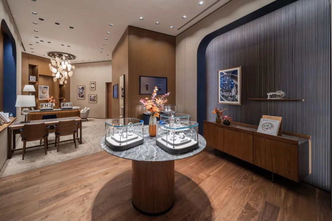 延续品牌一贯的设计风格,宝玑广州太古汇精品店兼具优雅奢华气质与现代美感。精湛严谨的传统工艺与不竭的制表热情贯穿于整个店铺设计之中,细节之处均可见宝玑的匠心理念。在柔和的灯光设计下,尊贵的宝玑蓝、温润的胡桃木、典雅的大理石与线条流畅的玻璃展柜相互映衬,展现品牌时计独特的机械美学与精妙的制表技艺。