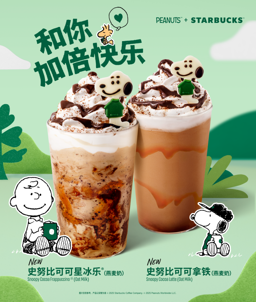 史努比“咖啡师”这次带来了两款星巴克限定饮品——史努比可可星冰乐,可可和香草风味融合浓郁燕麦奶搅打成冰沙,可可碎片的加入带来雀跃口感;史努比可可拿铁,可可风味融合燕麦奶,口感顺滑浓郁,更烘托出咖啡的香醇。两杯史努比限定饮品都在顶部搭配了搅打稀奶油和摩卡淋酱,更点缀有史努比形象巧克力片,并用焦糖酱装点杯身,旋转出加倍快乐!
