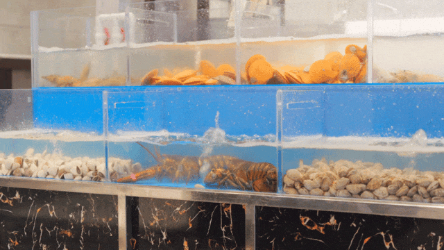 晚餐时刻的自助餐,还有海鲜蓄养池,现捞现煮,食材是看得见的新鲜!