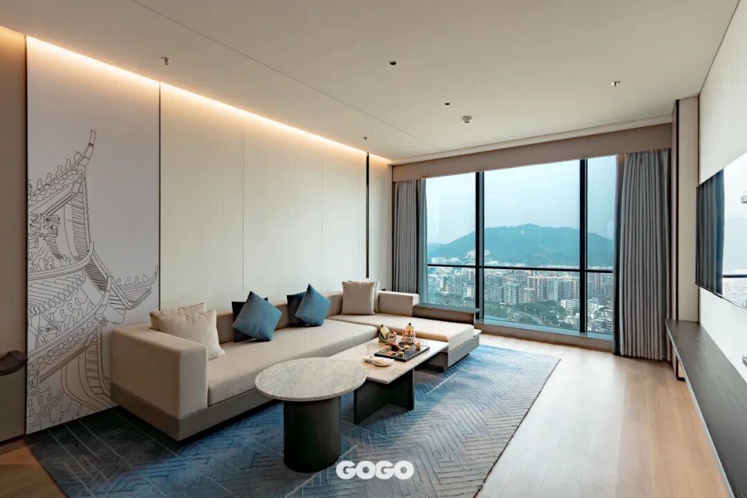 酒店将260间客房及套房布置在26-36楼,从客房楼层到客房内部都贯穿着“潮式生活美学”的概念——从潮汕骑楼以及祠堂常见的青花瓷碎片中,汲取灵感加以现代美学设计手法,将城市的历史文化与底蕴浓缩在这处自在的空间。