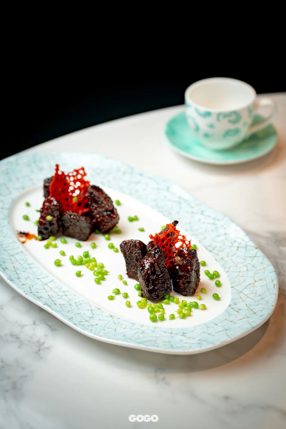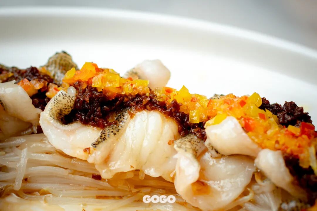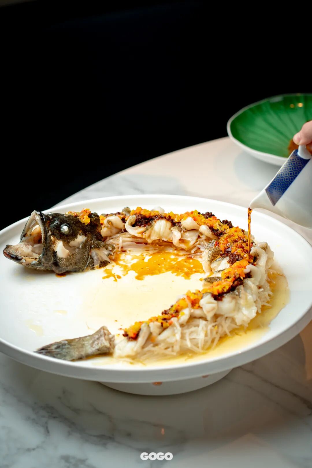 老虎斑肉质紧致,鱼刺较少,主厨将其去骨去刺后铺垫在银芽之上蒸熟。端上桌后,再浇上餐厅自制蒸鱼豉油,霎时间香味呼之欲出,入口细腻嫩滑,咸香鲜美的滋味在舌尖上萦绕,一吃难忘。