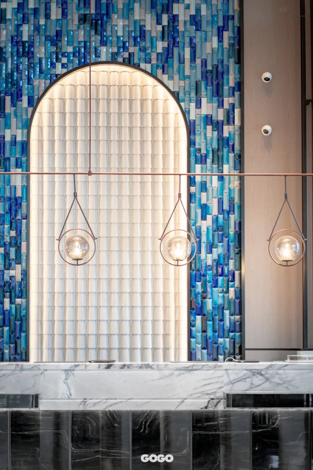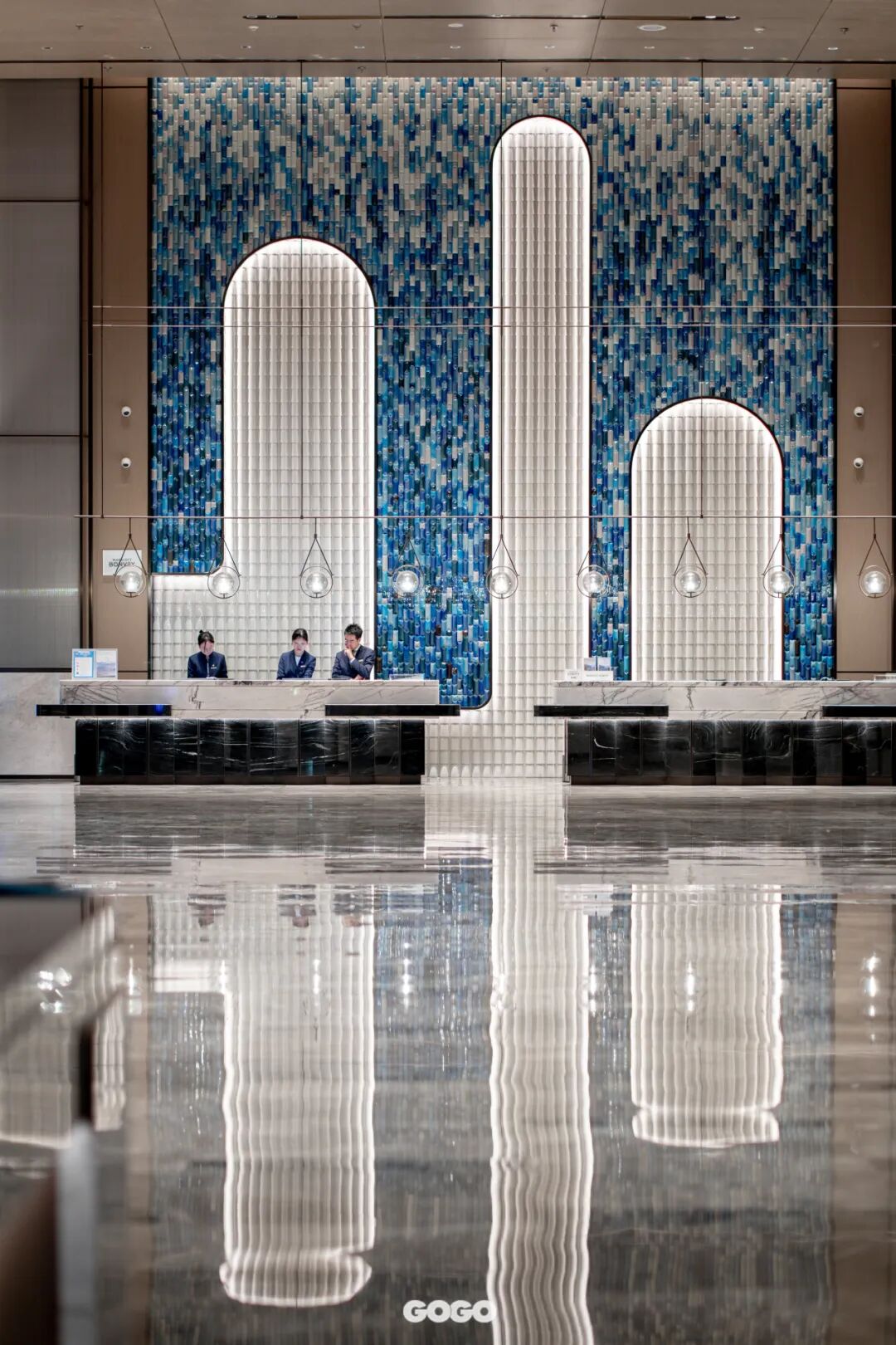 刚走入酒店大堂,映入眼帘的就是形态多变且油润的釉面瓷砖背景墙,非常吸睛。