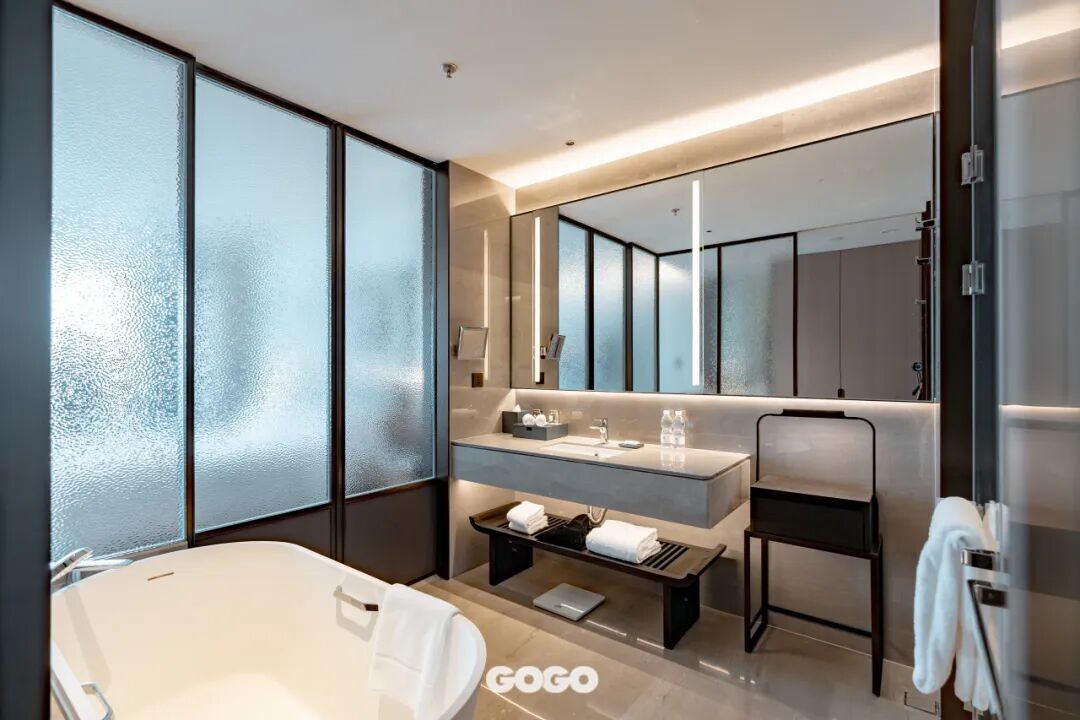 盥洗区域为双台盆设计,带有独立观景浴缸区域,套房的沐浴备品也升级为意大利知名品牌Ferragamo,细节非常贴心。