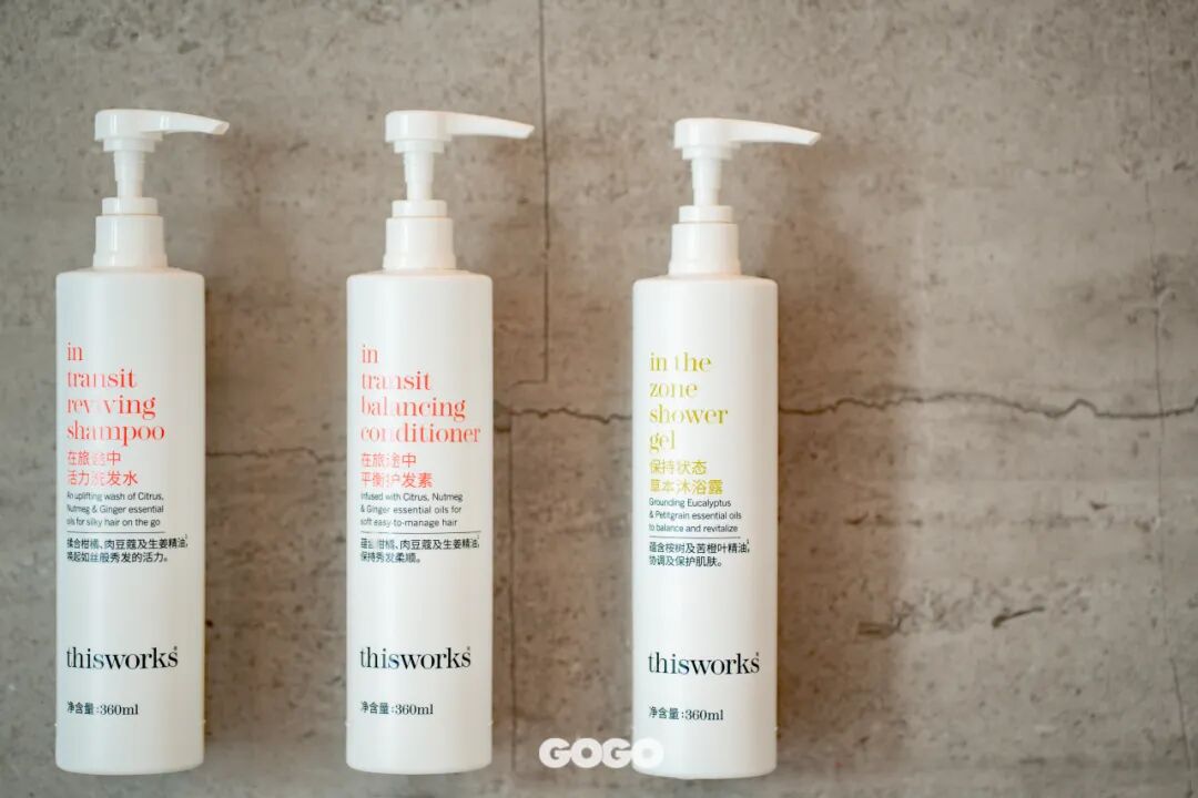 沐浴备品来自英国知名天然护肤品牌ThisWorks,香气成分也颇为讲究,精选柑橘、肉豆蔻、生姜、桉树、苦橙叶等草本植物,整体高级又好闻,揉搓出的泡沫绵密、细腻,让沐浴也变为享受时刻,这正如名字中的关键词——活力、平衡与保持状态。