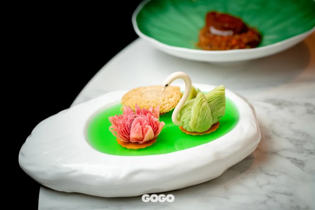 走入贡厨全日餐厅,映入眼帘的即是民国时期,潮汕绿釉窗花风格的装饰背景墙,就连四方四正的纹路灵感,也是来自于中国传统窗棂纹样中的“网格纹”,向客人展示着这里的艺术气息。