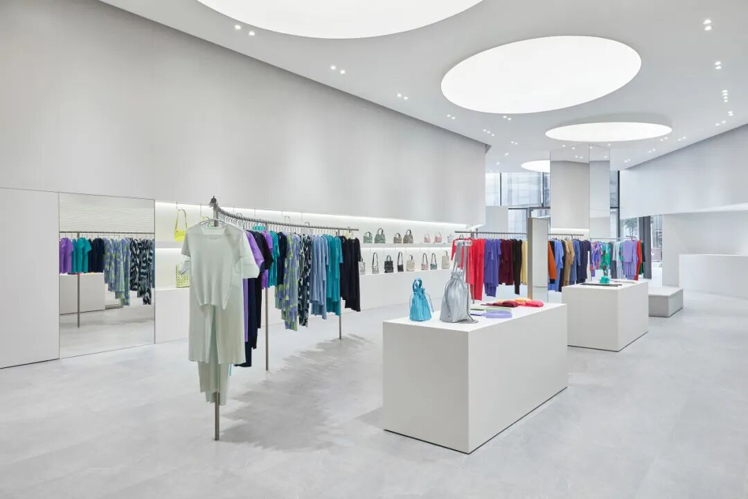 秉承一贯的品牌独特风格,关于褶皱的延伸也应用到了空间细节中,弧形陈列的流动线条牵动视线,每一处皆是褶皱元素的设计语言。