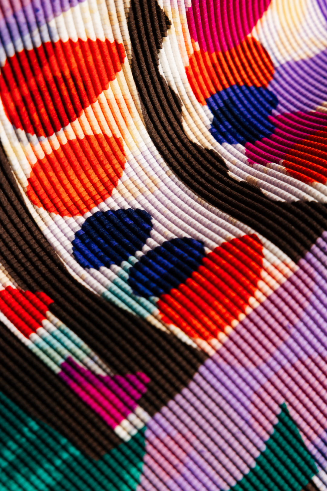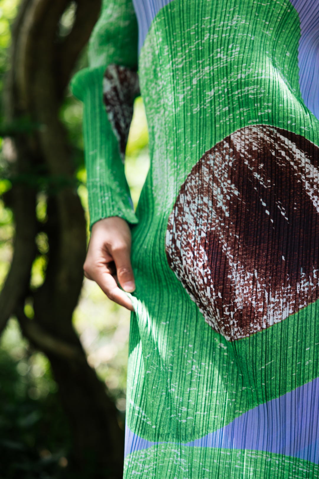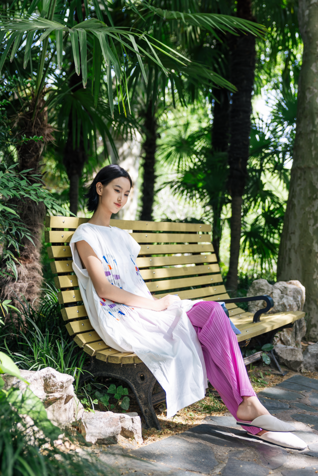 奔赴自然,着一件新裙传递轻柔之意。采用纸印工艺的图案设计,自由剪裁的纸张将颜色拓印至另一张纸上,创造出独特的图案,再以曲线构成有机形态,展现出动态的力量魅力。
