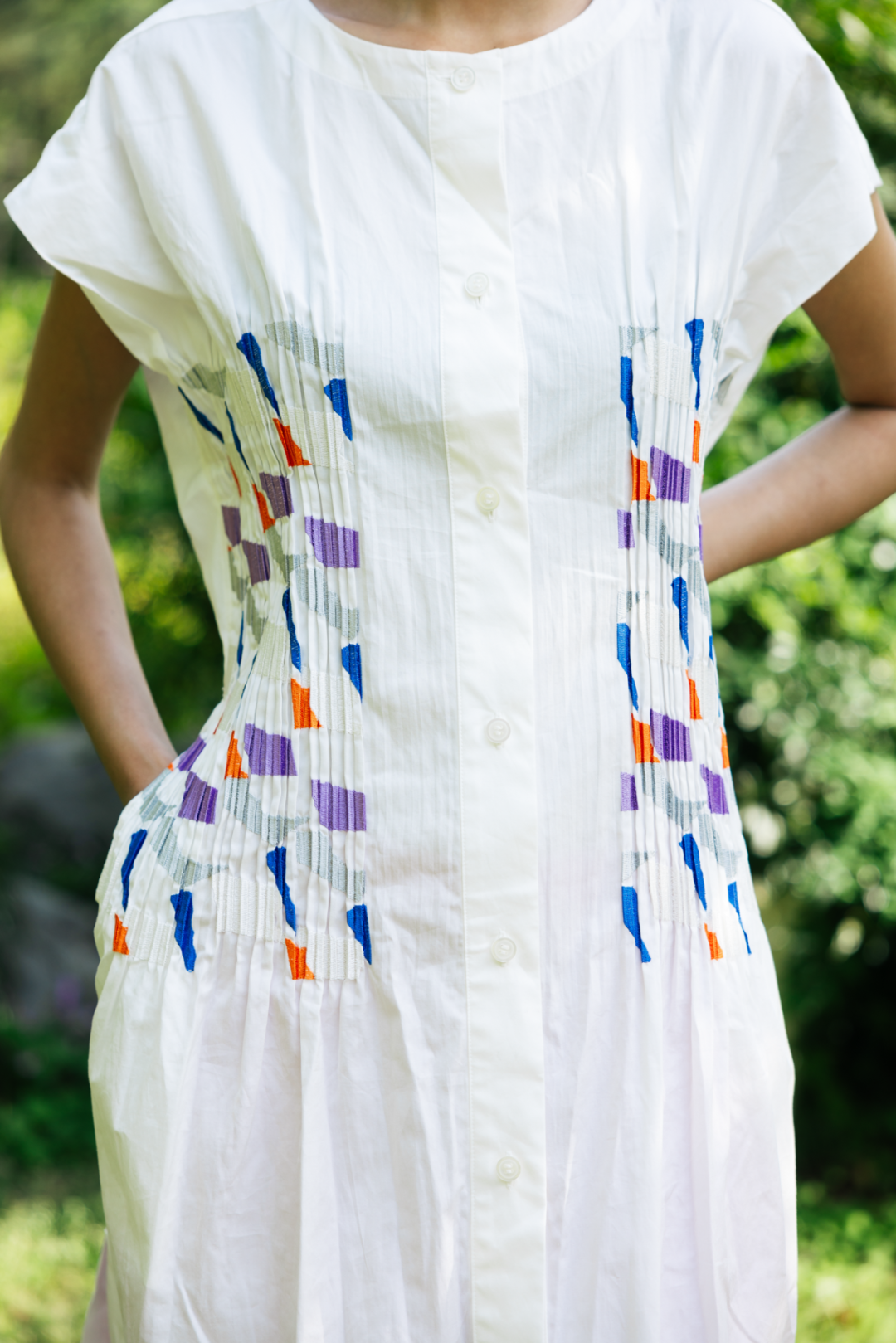 一件基础的白色衬衫裙也能脱颖而出,于腰间加入褶皱设计,视觉上提升腰线比例,多色点缀增添一丝活力与灵趣。