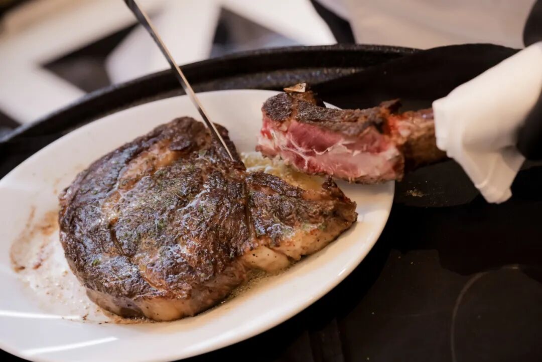 当牛排端上餐桌时,还会特别放置在已经加热到260℃的陶瓷盘中,让牛排始终保持在恒定“醒肉”温度,让热量慢慢渗透到牛排中心,让肉汁回流至牛排的外围,在这个过程中,“滋滋作响”的牛排与飘香四溢的味道,让人忍不住食指大动!