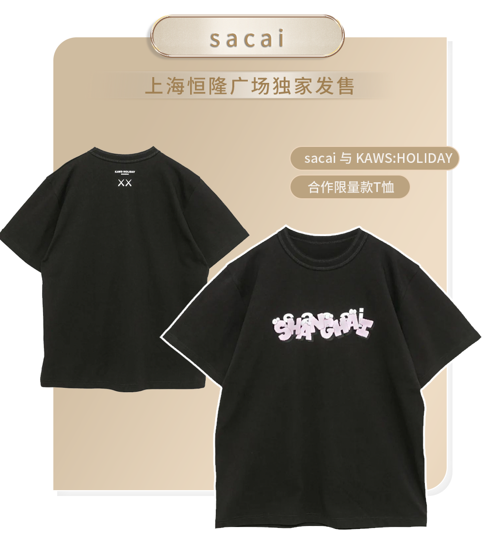 为庆祝KAWS:HOLIDAY第11站即将登陆上海,sacai与KAWS:HOLIDAY合作推出限量款T恤,黑色T恤将于8月31日下午1点,于sacai上海恒隆广场店独家发售(先到先得,售完即止)。