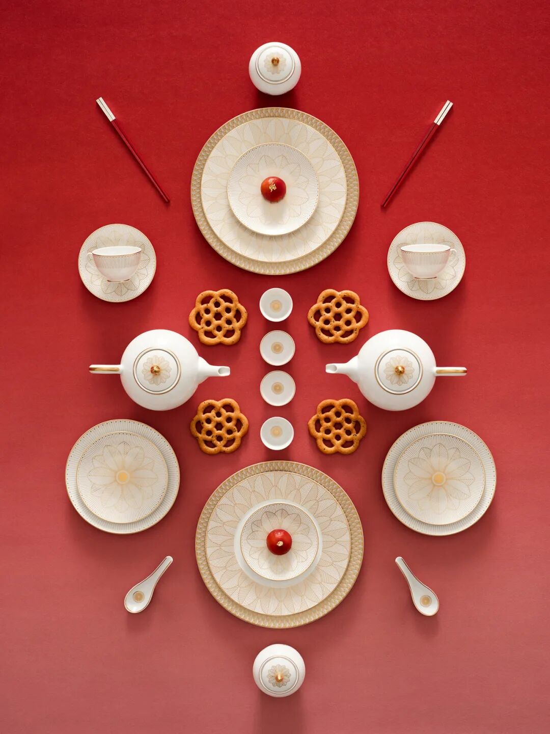 主题大片中,世家经典 Malmaison Impériale马勒梅松帝国系列瓷器耀目登场。全新推出的茶壶、茶杯、咖啡杯碟,精致典雅,细腻勾勒出节日下午茶的温馨欢聚之景;餐盘全系列则为新春家宴增添华章,以其华美的身姿承载佳肴美馔。