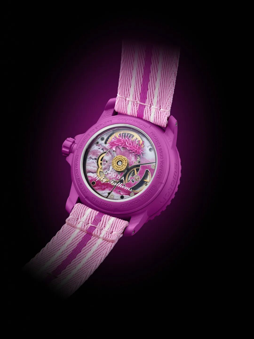 斯沃琪标志性 SISTEM51 机芯上饰有粉色水域与裸鳃类动物玫瑰色角海牛( Ceratodoris rosacea) 的数字印花图案。PINK OCEAN 腕表将于全球指定瑞士斯沃琪门店发售。