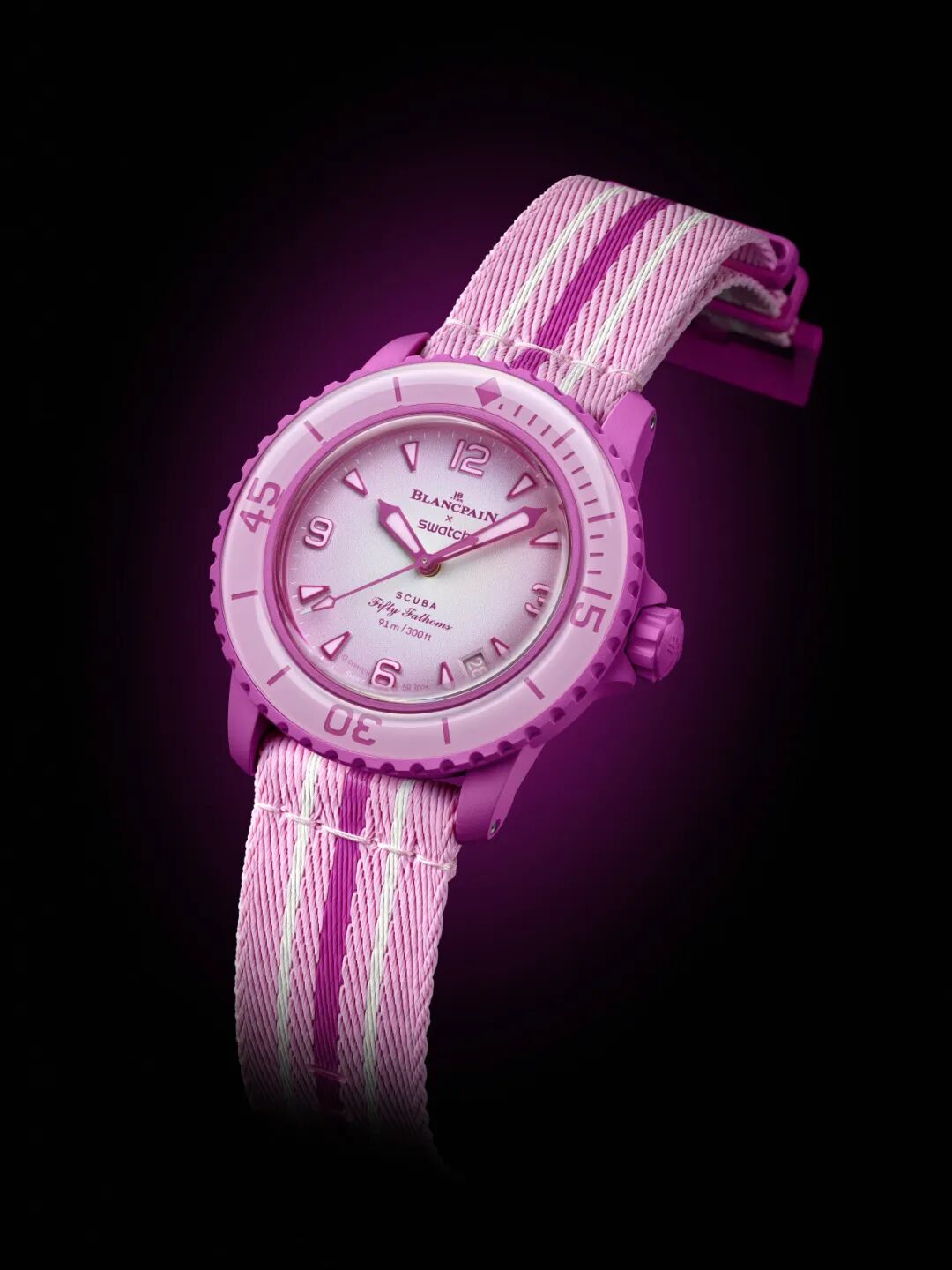PINK OCEAN 是 Bioceramic Scuba Fifty Fathoms 系列全新腕表,旨在致敬宝珀潜水表鼻祖五十噚系列 (Fifty Fathoms)。这款非限量腕表采用斯沃琪专利研发的创新性植物陶瓷 (Bioceramic) 材质,并选用了为该系列特别研发的独特粉红色调。PINK OCEAN 腕表从粉色的湖泊、海滩和海湾中汲取灵感,呈现鲜艳明媚的配色,演绎了自然中的精致色彩和迷人景观的精髓。