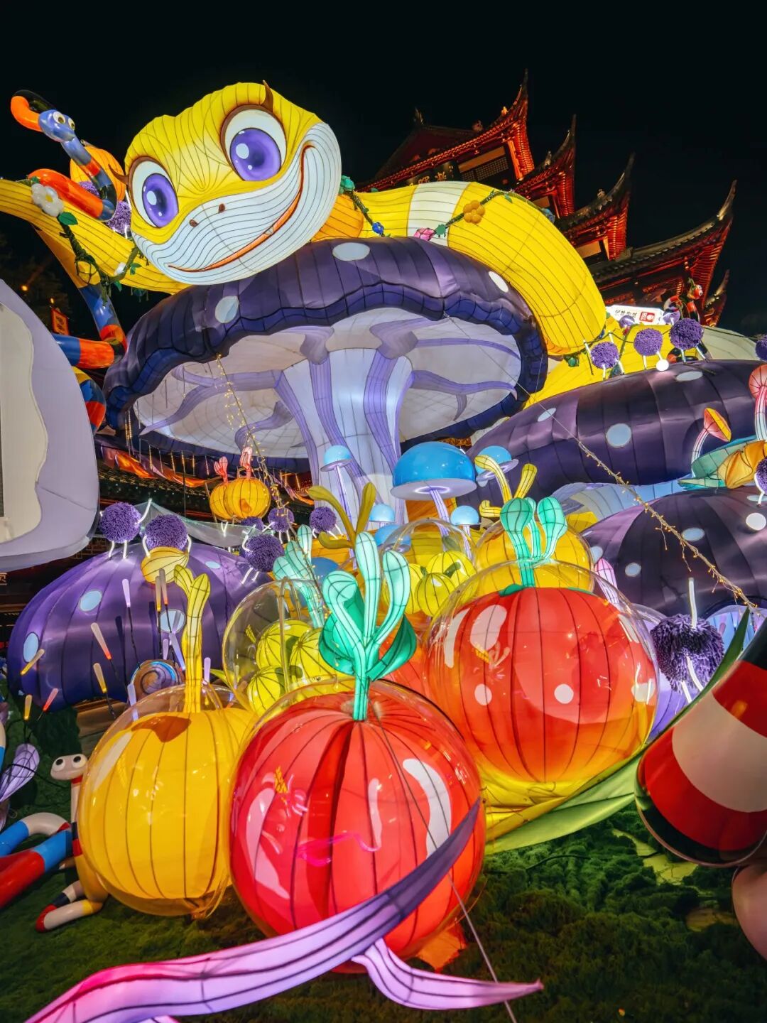 每年豫园灯会的亮灯仪式,已经成为灯会必不可少的环节。今年的亮灯仪式还加入了不少“黑科技”,在中心广场“金蛇献瑞”灯组前,花仙子降临奇妙丛林,轻柔敲击蘑菇造型乐器,舞台中心的花朵缓缓绽放,焕彩灯光随音乐变幻闪动,全域灯组渐次点亮,光华璀璨,宣告豫园灯会启幕,灵蛇随《金蛇狂舞》的变奏曲起舞,游人手中的提灯会同步随着音乐和金蛇的舞动节奏闪烁并变换颜色,增强沉浸体验,使游人在视觉、听觉上全面感受自然。