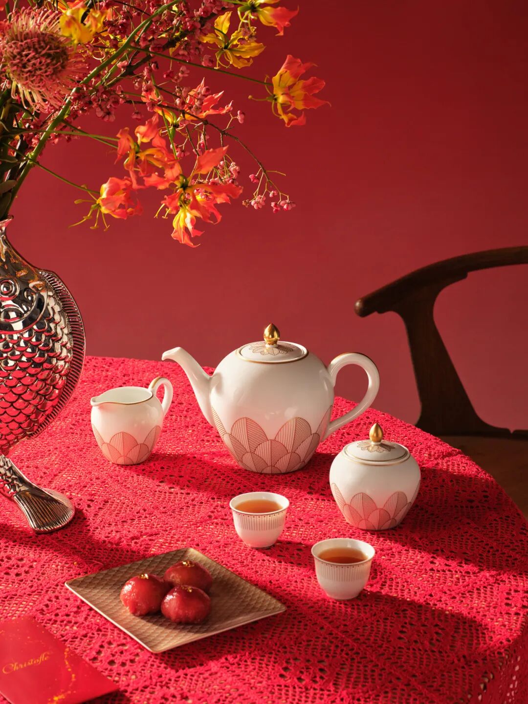 餐桌中央,镀银双鱼花瓶闪耀夺目。双鱼花瓶构想自19世纪装饰艺术大师埃米尔・雷伯(Émile Reiber)设计,经 Christofle 匠心演绎并重新复刻。两条交织之鱼传递对称动态美学,镀银材质(高33.5厘米)整体铸造,细节之处尽显工作室对品质的极致追求,鱼目鱼鳍栩栩如生,置于餐桌之上,熠熠生辉,为团聚时光增辉添彩,亦承载着年年有余的吉祥祈愿。