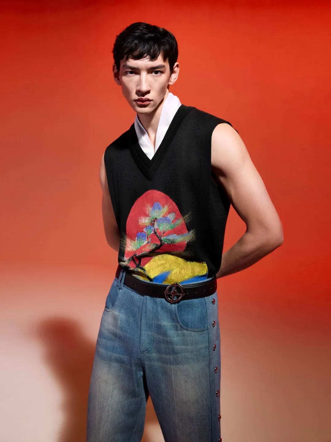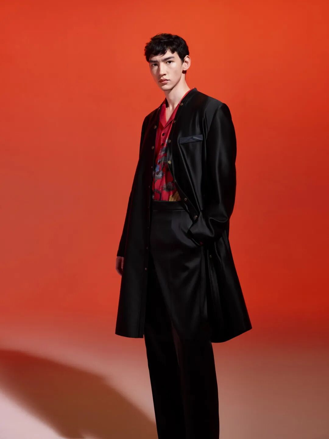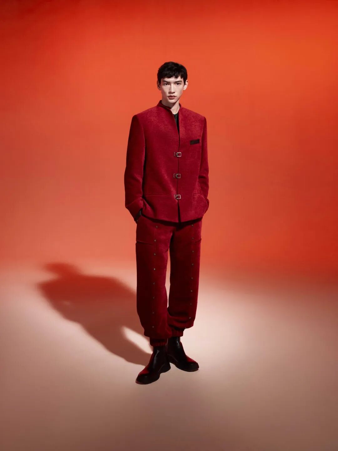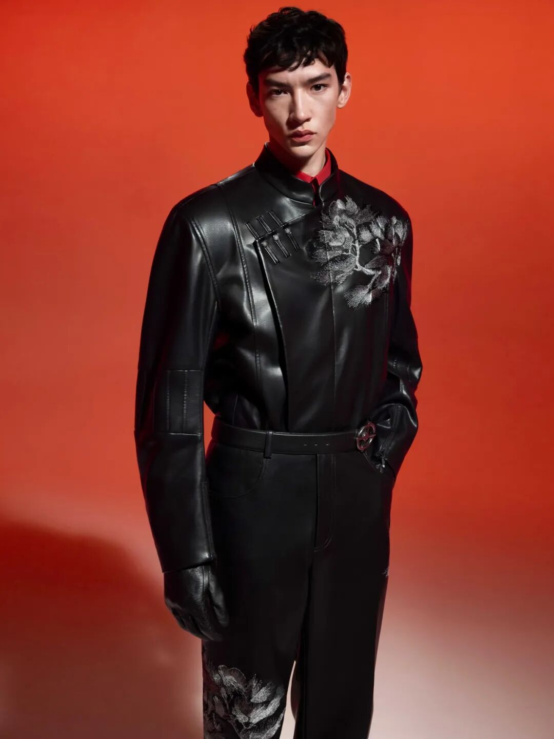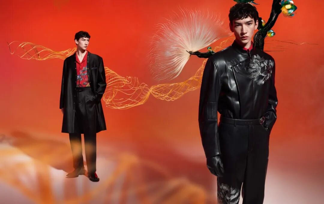 该系列多用缎面、皮革等材质,结合重工刺绣和印花工艺,以现代质感描摹中式优雅,园林花卉图案仿佛盛开在衣襟之间,细腻而隽永。重工刺绣融入皮革设计,斜襟搭载小立领演绎中式挺拔之美;手绘涂层结合毛织图案,营造丰富层次感,传递吉祥喜庆的意蕴;经典小立领休闲西装套装,以绒面质感搭配中式正红,带来冬日温暖的气息。