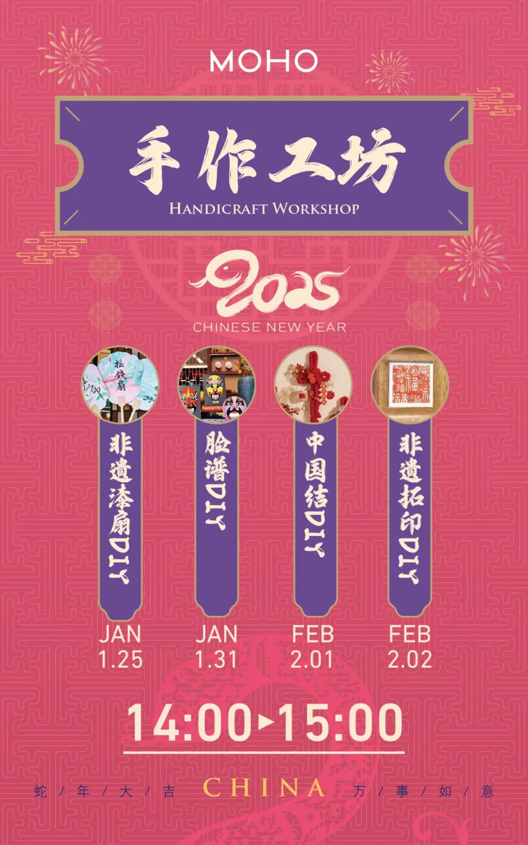 1月25日-2月2日,静安MOHO将携手民间艺术家,推出“非遗造物坊”主题活动,展现糖画、非遗草编、捏面人等非遗文化魅力。更有社群活动,如脸谱、非遗拓印、非遗漆扇及中国结等DIY手作工坊,诚邀市民游客相聚MOHO共享文化盛宴。