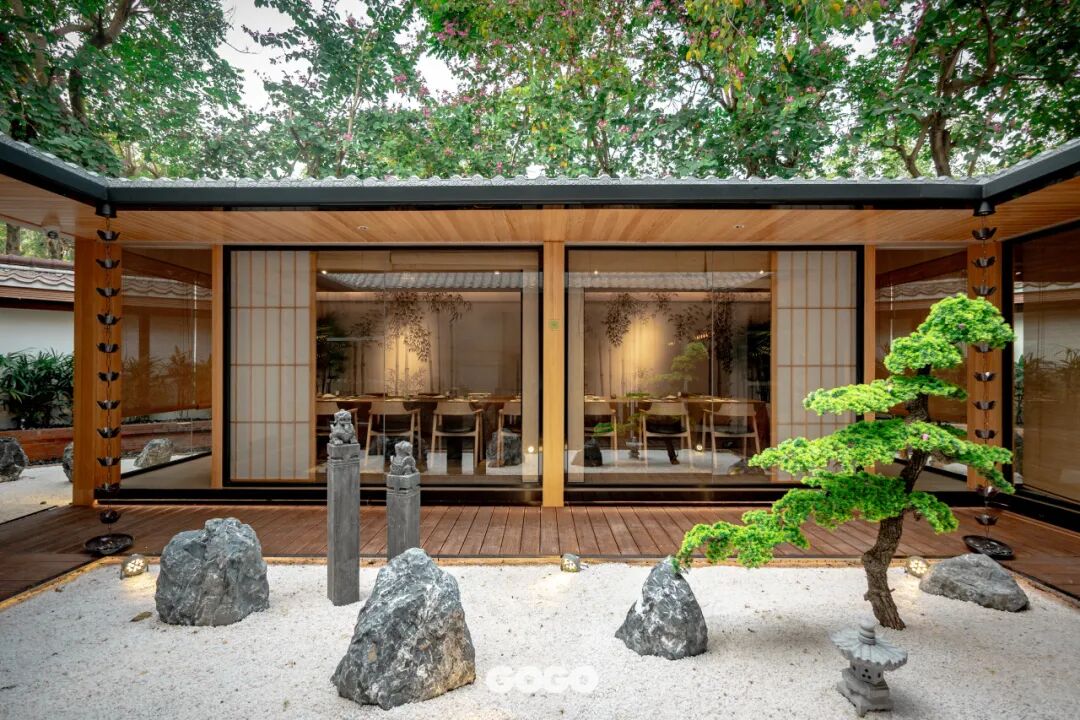 秉承打造地道日式风味与氛围的品牌理念这家新开的「四叶料理」餐厅将550㎡空间融入古朴、素雅、禅意系围满满的「和风枯山水庭院」。