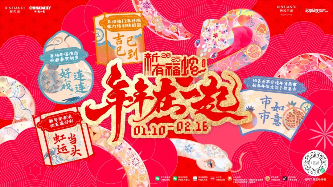 在2025年新春之际,XINTIANDI新天地品牌携手中国日报国际版头版插图主笔李旻,以“新有福蛇”为主题,用当代语言演绎“传统”春节,于旗下五城八座呈现具有中国审美质感的新春系列活动,将“传统”融入现代生活方式,为消费者带来充满“年味”的农历新春,打造一站式购物体验,为假日经济注入活力。