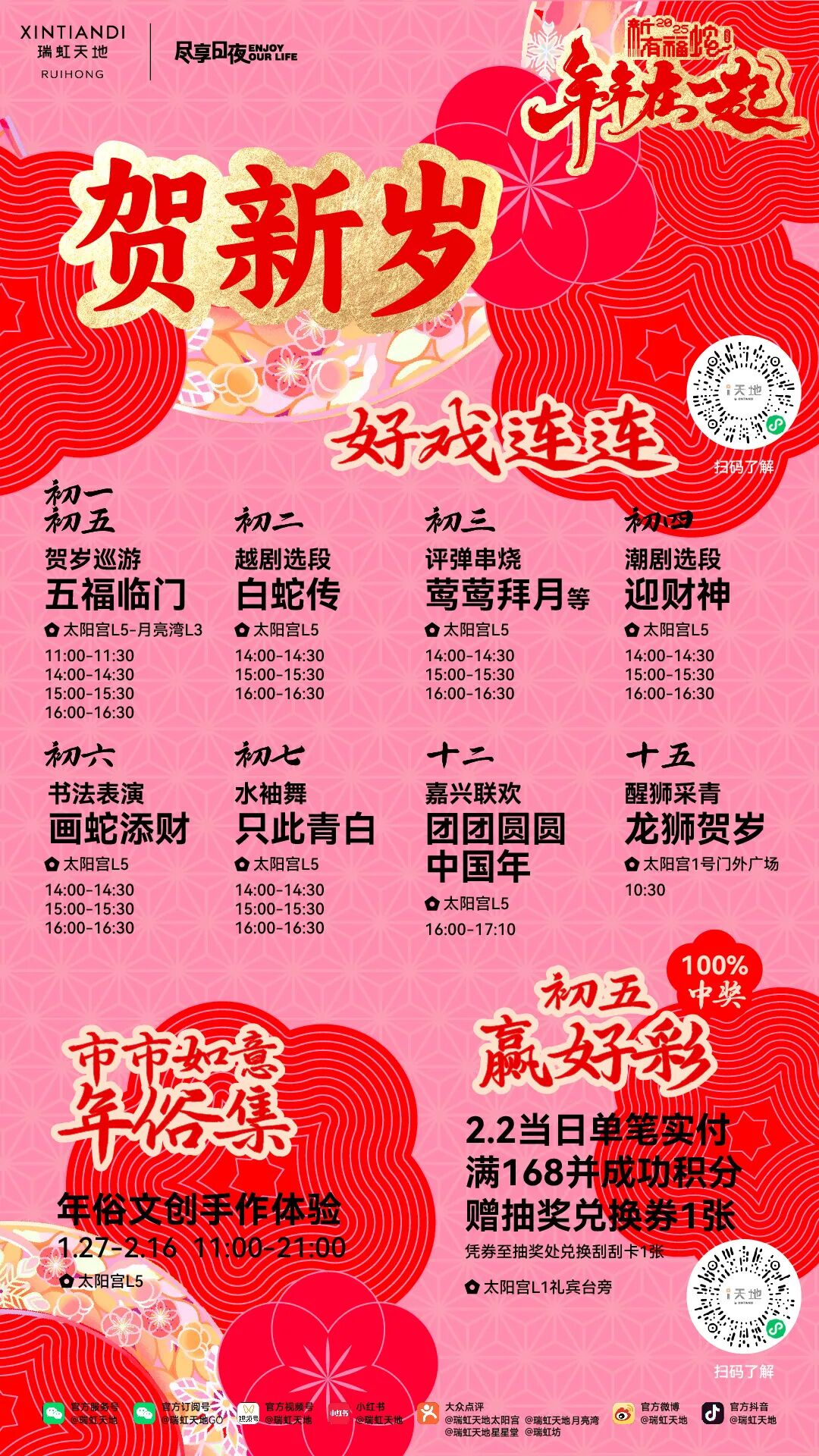 大年初一起,将结合蛇年元素与传统越剧、评弹、潮剧、水袖舞、书法秀、巡游等演绎形式,在太阳宫为消费者带来诚意满满的年俗盛宴,喜迎蛇年;更有嘉兴社区阖家同乐的新春汇演,元宵节当天举办的开年舞龙醒狮采青活动,及情人节的月老小站等精彩活动,盛情邀请大家前来瑞虹天地,共度佳节。